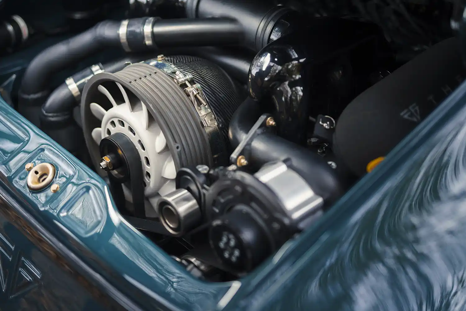 As Hawley explains: “We opted for the charge coolers as they negate the need for an intercooler – challenging to package in a 964’s compact engine bay. This setup means we can avoid adding air intake apertures to the bodywork, retain the super-clean, distinctly ‘Theon’ look that’s so important to us, both in the engine bay, and externally. The water-methanol solution adds an additional source of cooling, whilst also upping the octane rating of the fuel from 98 to 110+, providing a significant increase in power, too.”