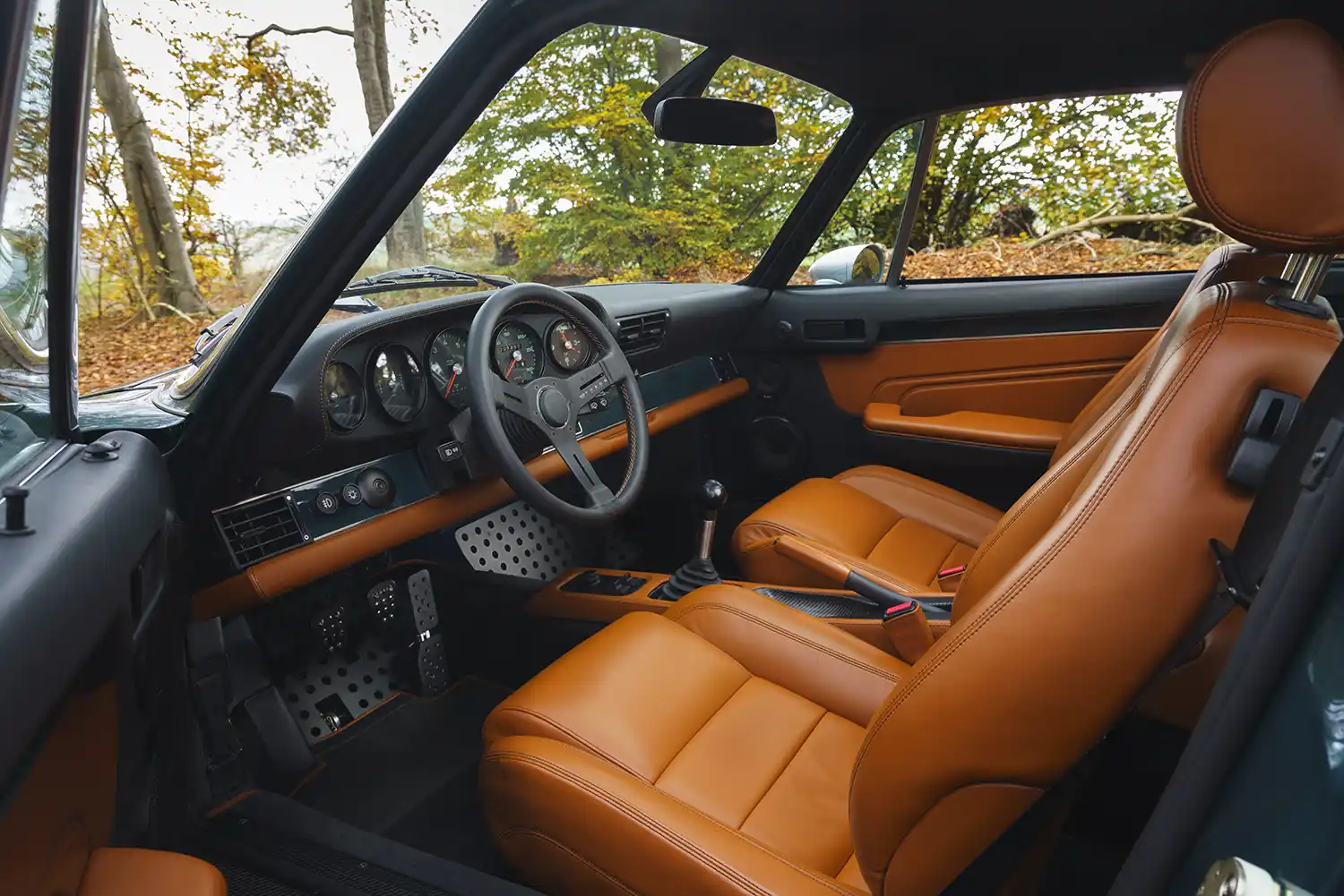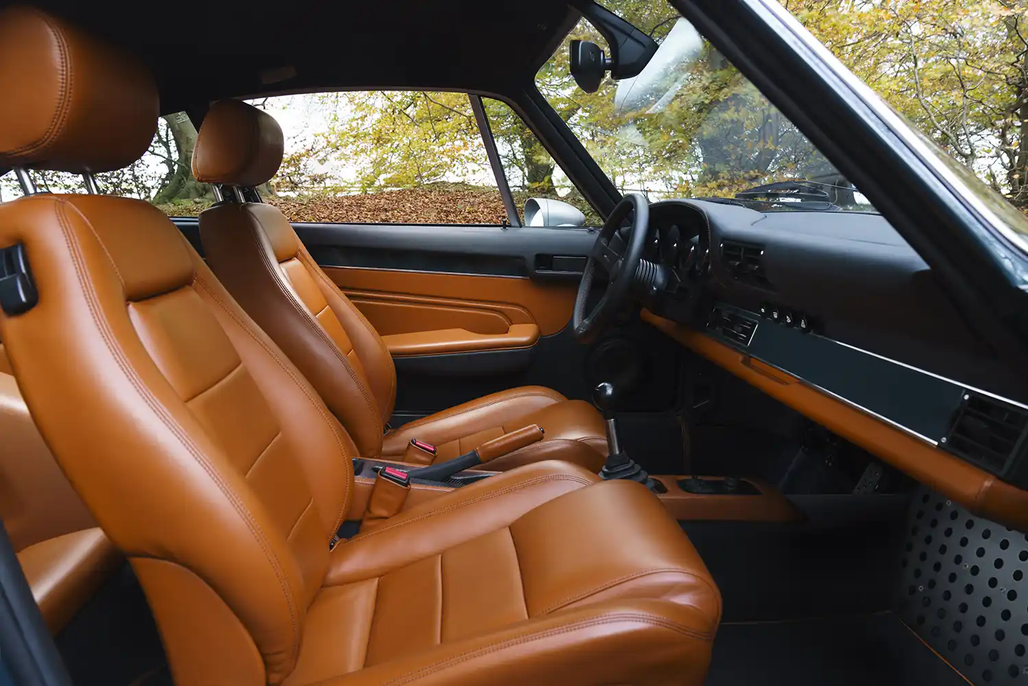 BEL001 features ‘touring’ front seats, based on Porsche Recaro frames and mechanisms, but modified with updated and custom shaped foams, elevating comfort and support in equal measure. The seats are then impeccably trimmed in soft tan leather. The rest of the interior is trimmed in matching tan leather, with black accents, all complemented by body colour matched elements on the dash, doors and rear quarter panels.
