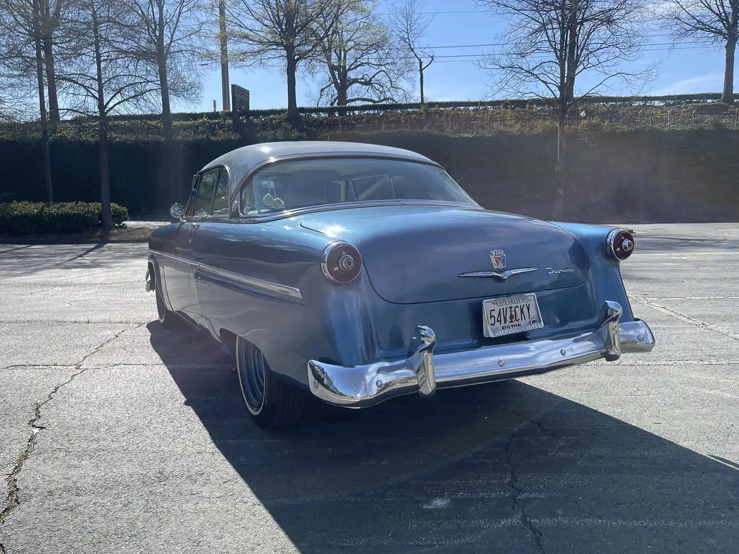 Classic 50s Flair: The exterior of this Crestline Victoria exudes the iconic design language of the mid-1950s. The metallic blue finish, complemented by the crisp white roof, gives it a stylish and eye-catching appearance. Chrome bumpers and a front push bar add to the period-correct aesthetic, along with a hood ornament and dual side mirrors. The dual exhaust system, exiting ahead of the rear wheels, hints at the V8 power within.