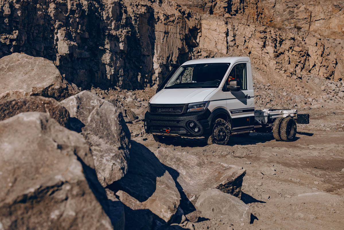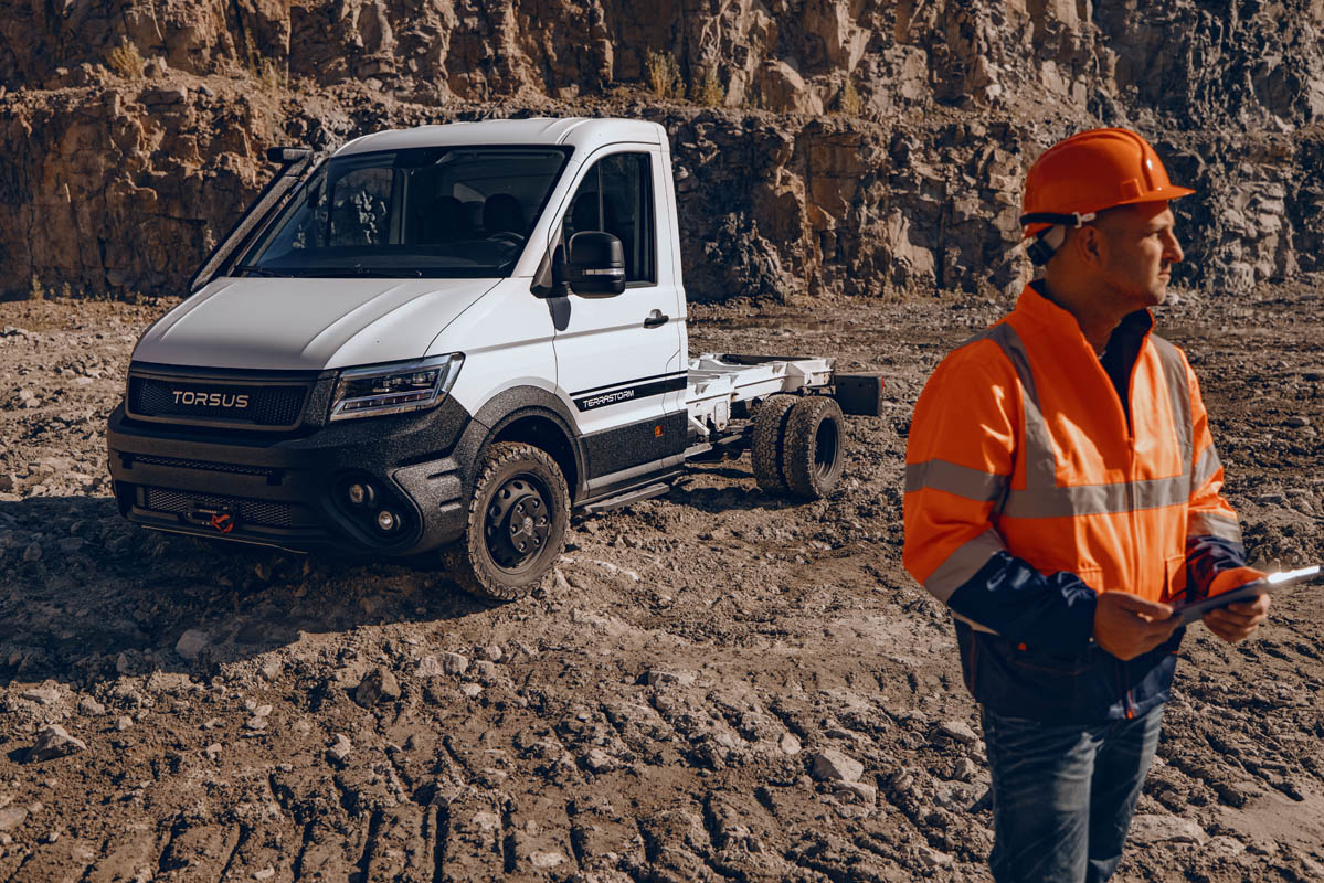 TORSUS, manufacturer of one of the world’s toughest, heavy-duty off-road vehicles reveals its latest creation for the commercial sector with TERRASTORM CHASSIS, a versatile 4×4 all-terrain Flatframe chassis, ready to carry cargo or be converted into a truck with a Recovery Vehicle flatbed, Dropside or Tipper configuration. Available to order from 1 January 2022 and with prices starting at €51,716, the first TERRASTORM CHASSIS deliveries will commence in 2022 in both left-hand and right-hand drive.