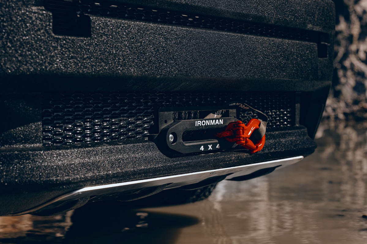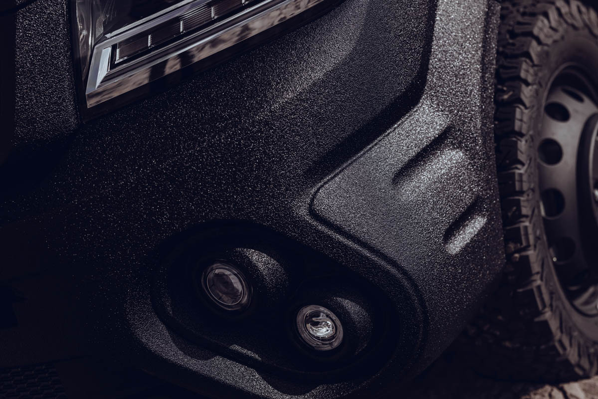 The TORSUS bumper was designed to offer improved off-road capabilities with better approach angle. It hosts the LED high beam, daytime running lights, fog lights and spotlights as well as the integrated winch capable of towing up to 5,500kg (5.5 tonnes), which is hidden away only to be dispatched when you really need it. As part of the underside protection, the bespoke Duraluminium skid plates running from the engine and gearbox down to the rear differential and fuel tank protect the truck from being damaged in inhospitable conditions.