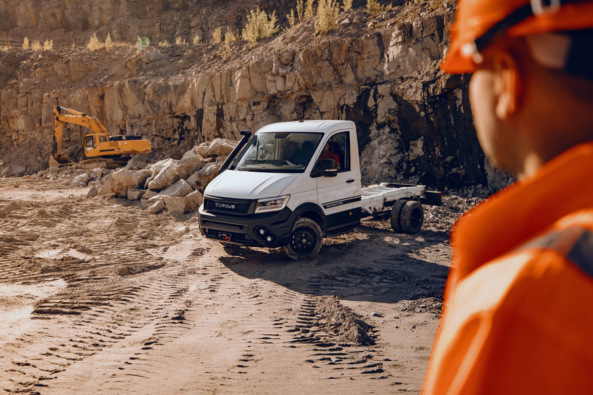 Engineered and manufactured at TORSUS’ production plant in Slovakia, the heart of vehicle manufacturing in Central Europe, the team applied its expert knowledge gained from producing the PRAETORIAN and TERRASTORM, the world’s first production off-road buses, to design a new ultra-tough 4×4 TERASTORM CHASSIS Flatframe truck. Configurable with either a single or double cab to transport people and cargo to some of the world’s most inhospitable places, the TERRASTORM CHASSIS is dependable and pushes the commercial vehicle sector to new limits.