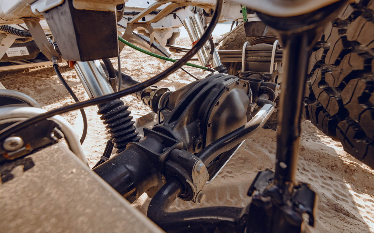 At the rear, the suspension is a combination of leaf springs equipped with Ironman 4×4 Load Plus and Profender Dakar shock absorbers with remote auxiliary reservoirs extended axle stroke. The combination of uprated off-road suspension and heavy-duty 17-inch BF Goodrich All Terrain T/A KO2 tyres gives the TERRASTORM CHASSIS a ground clearance of 250mm, approach and departure angles of 26°and 20°.
