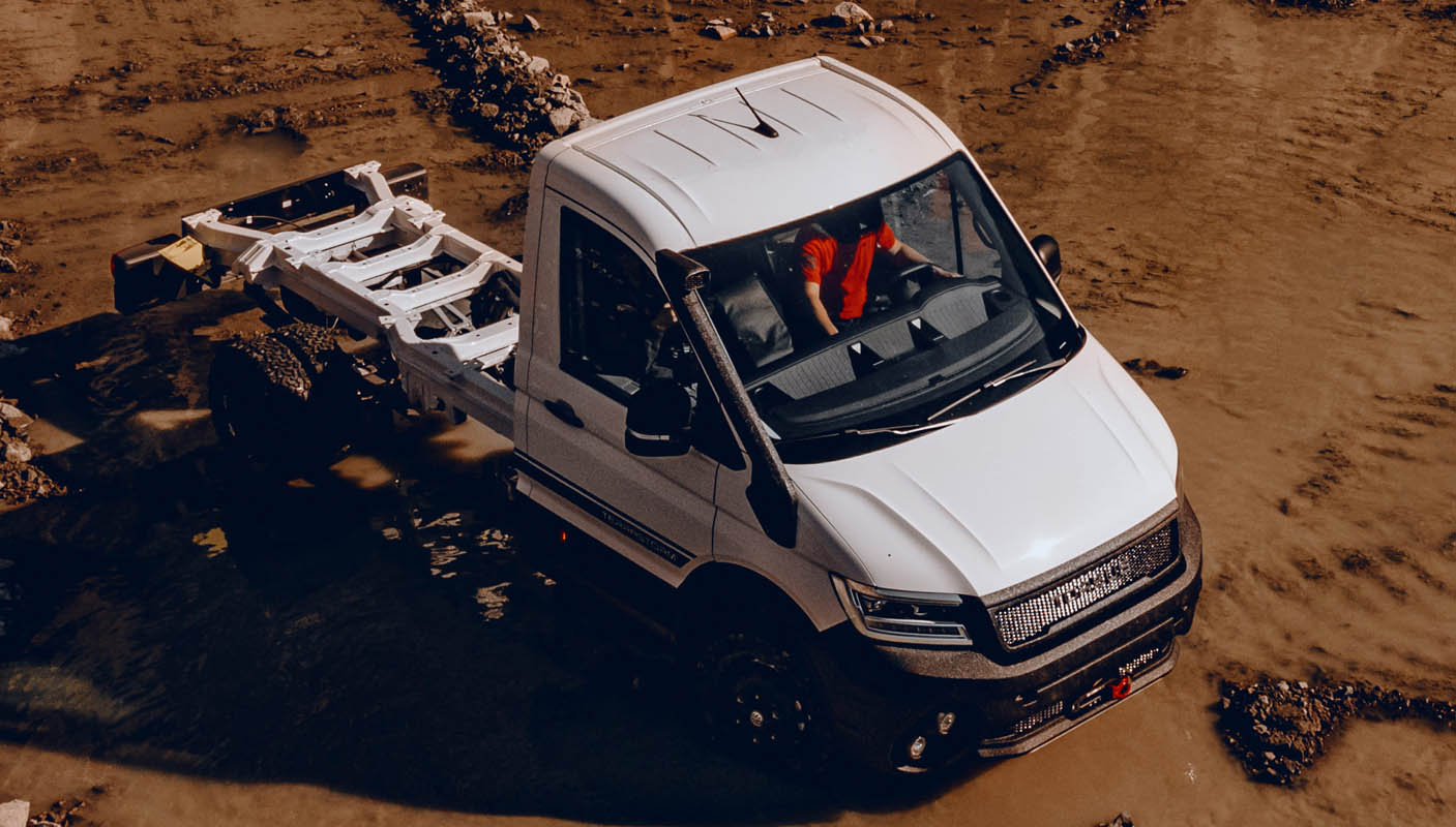 TERRASTORM CHASSIS is designed to be a versatile all-terrain workhorse with single or double cab options on each of the versions; with different Gross Vehicle Weight – 3.5t, 5t or 5.5t as well as variable lengths L3 (wheelbase: 3640mm; length: 5996mm) or L4 (wheelbase: 4490mm; length: 6846mm).