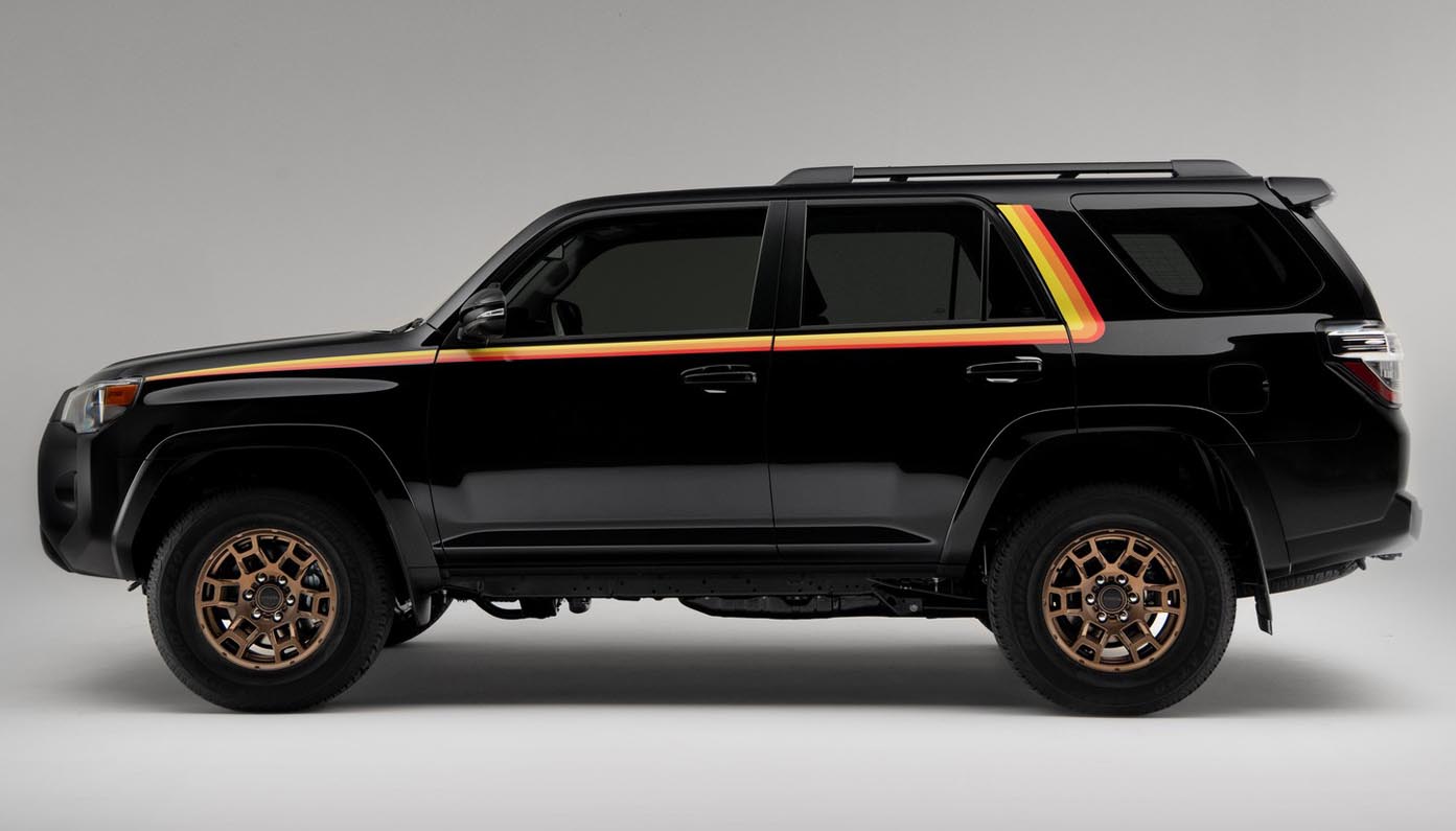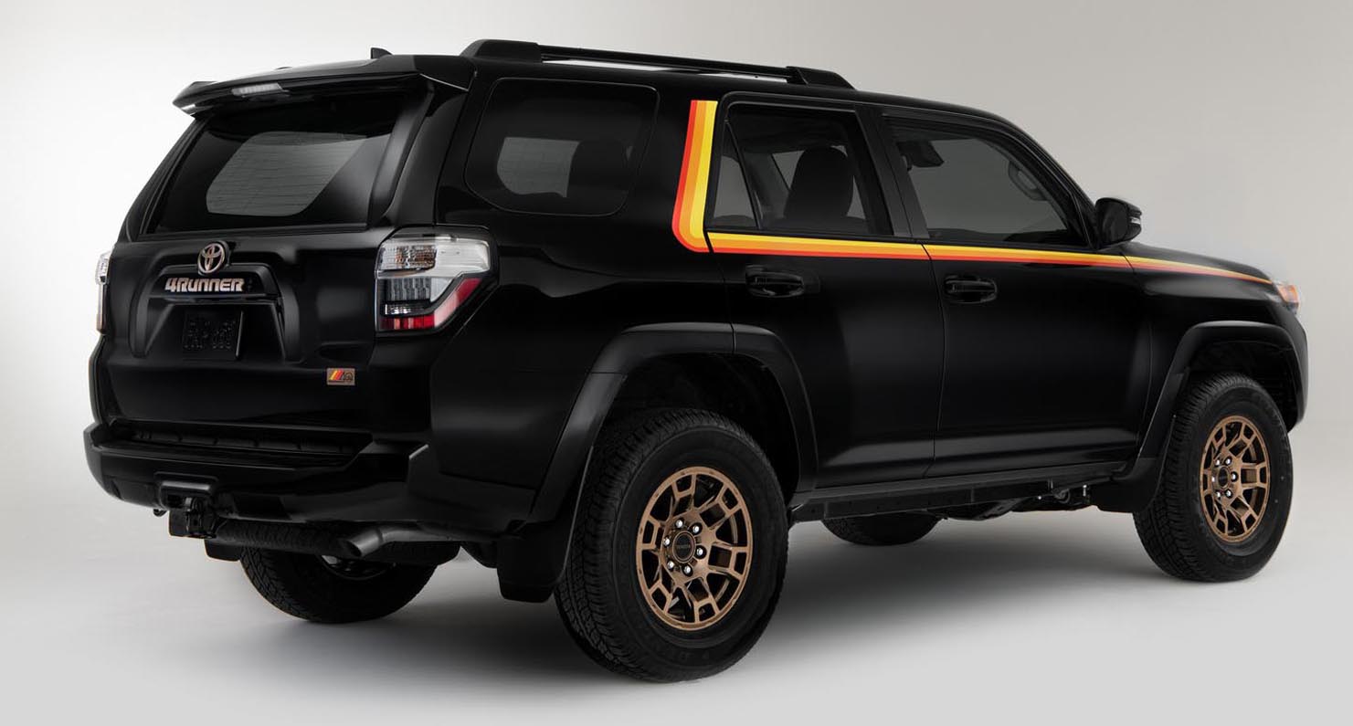 The biggest eye-catcher, though, is likely to be the heritage graphics package created especially for this anniversary model. The first 4Runner was built on the Toyota pickup platform, which itself founded the heritage of Toyota’s illustrious success in off-road racing. As an homage to those early racers, the 4Runner 40th Anniversary Edition will be wearing some very cool, retro-inspired yellow/orange/red body graphics.