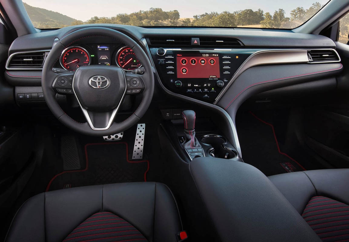 Inside, the Toyota Camry TRD driver will be seeing red – in the trim, that is. The cabin is decked out with Black Sport SofTex®-trimmed front seats with fabric inserts, red accents and red-stitched TRD embroidered headrests.