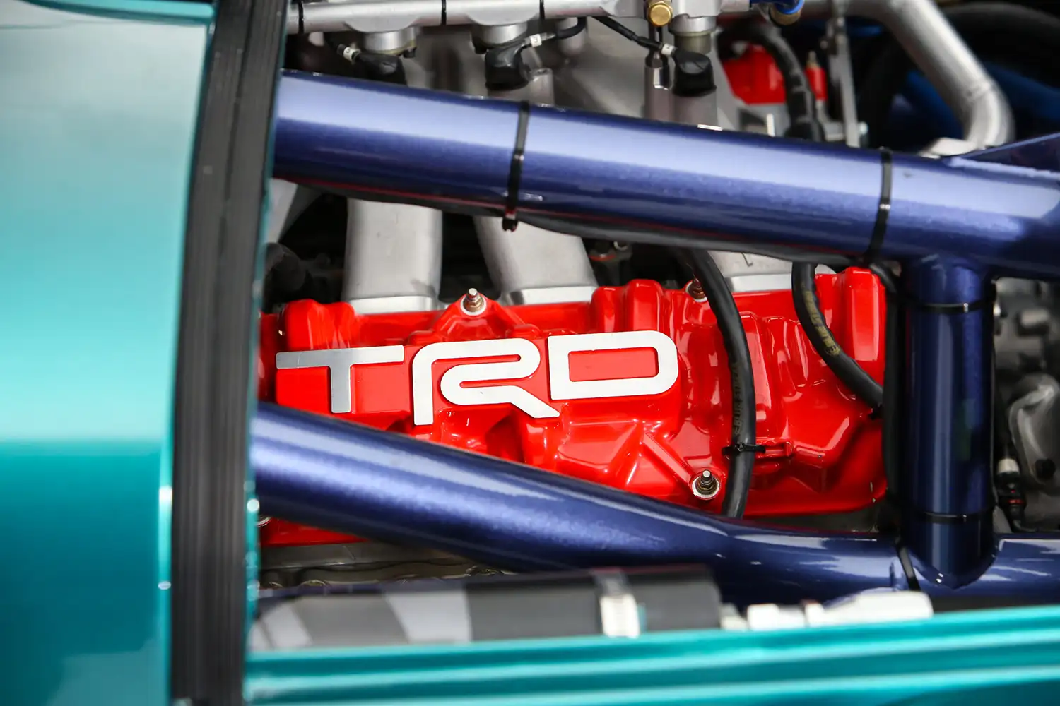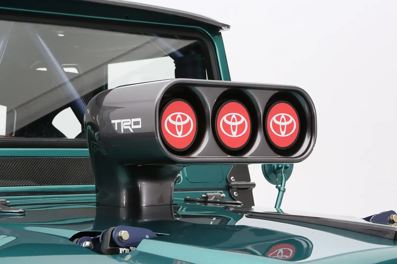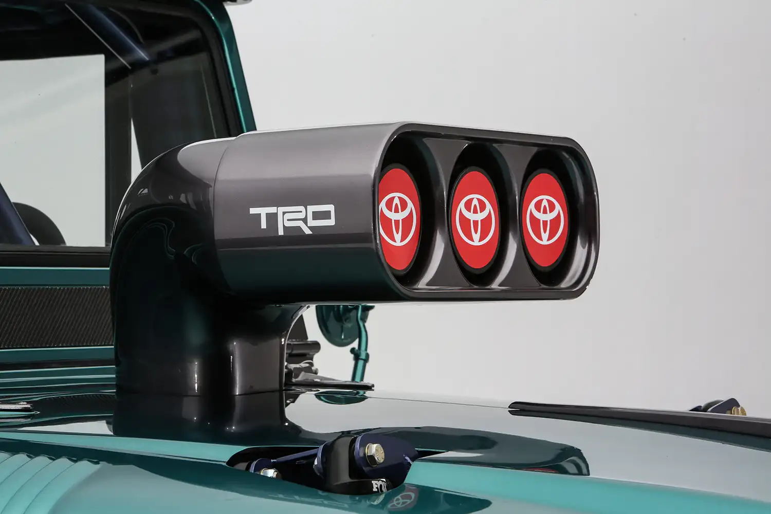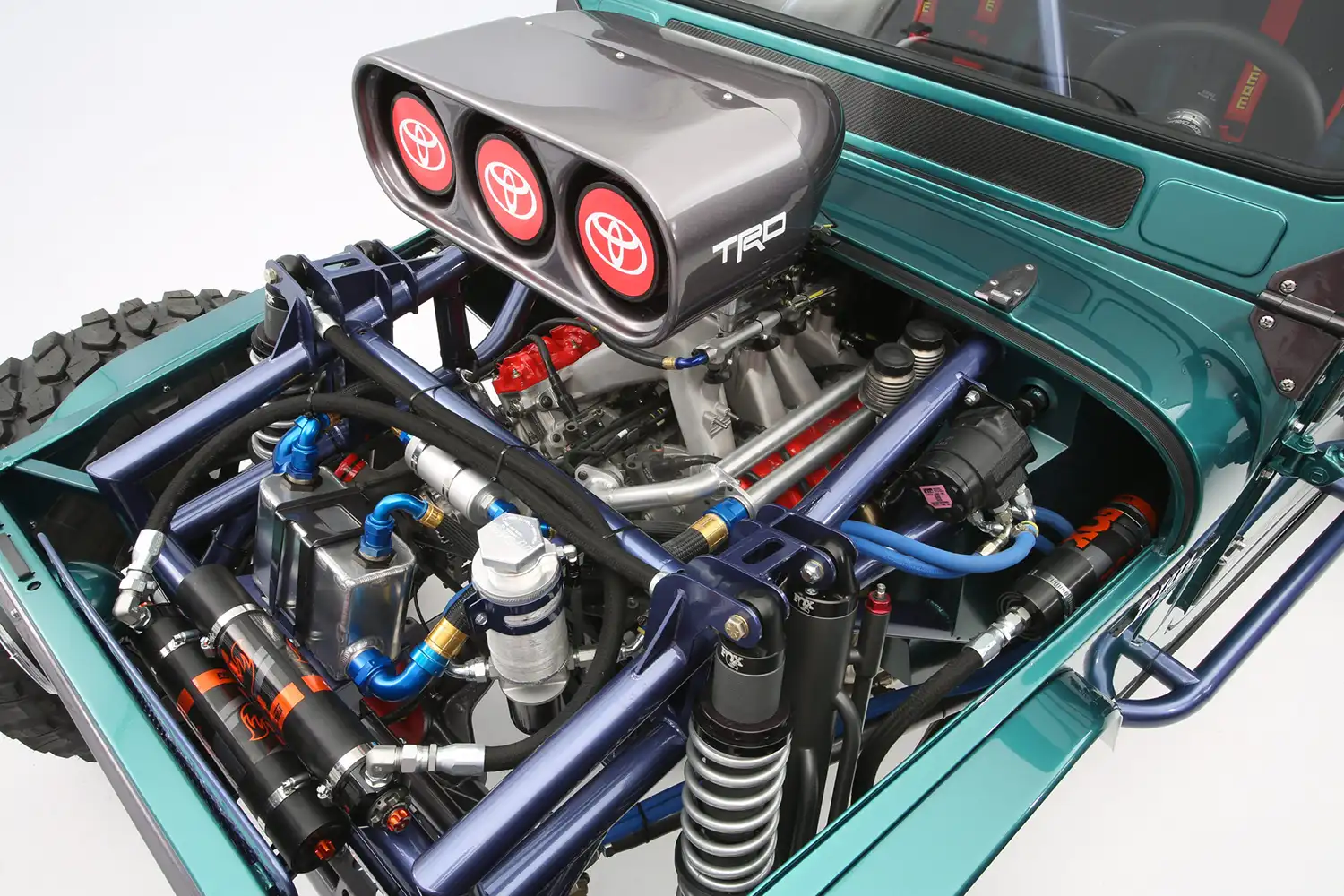 The team’s first call was to Toyota Racing Development in Costa Mesa, Calif. This build needed more than just a loud bark to live up to its extreme performance mandate, so they secured a modified version of Toyota’s current TRD, 358 cu.in. V8 NASCAR® Cup Car powerplant, which produces 725 horsepower. A MagnaFlow® exhaust delivers the engine’s intimidating exhaust note, and power is transferred by way of a 3-speed automatic race-built Rancho Drivetrain Engineering® transmission.