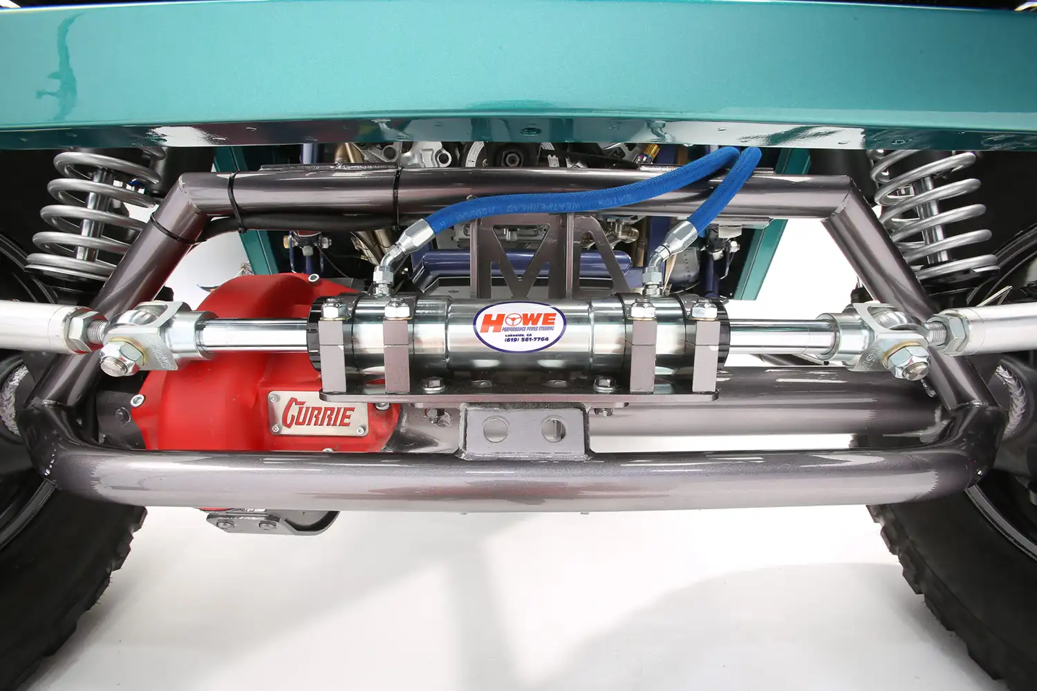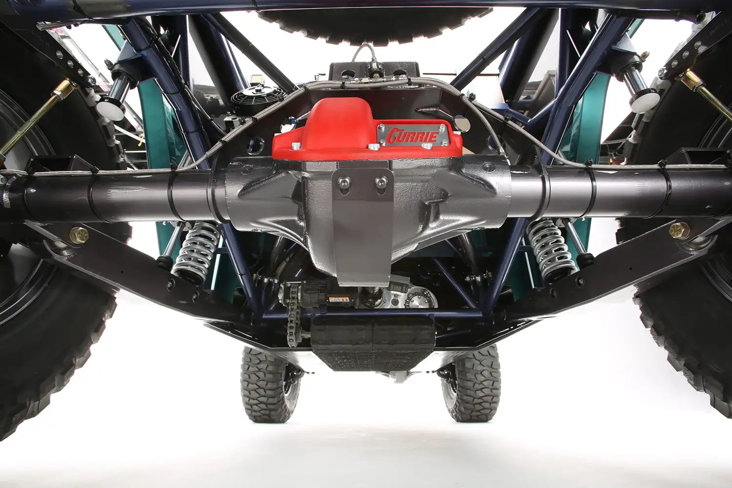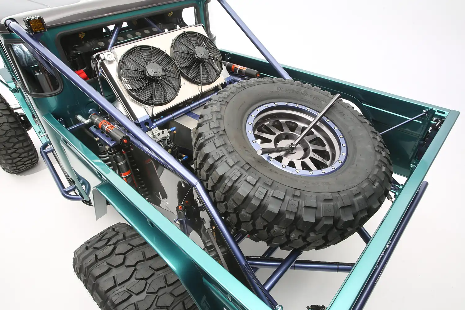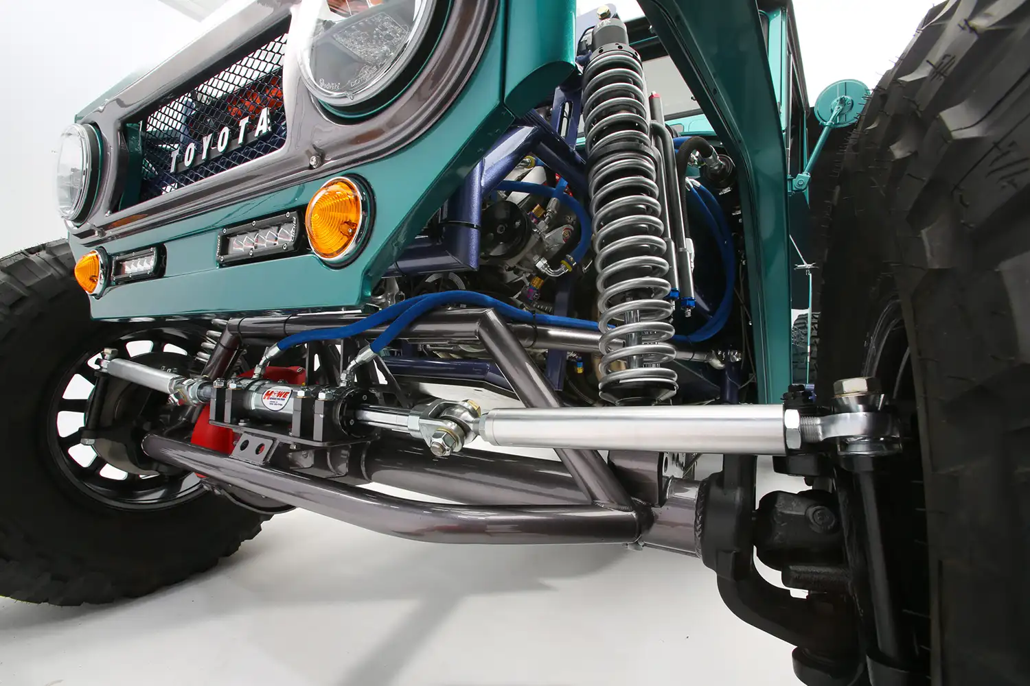 In true old school brawn fashion, FJ Bruiser remains a solid axle vehicle. Purpose built with “unstoppable” as a stipulation on its build sheet, the driveline features front and rear Currie® differentials and an Advanced Adapter Atlas® transfer case that provides four 2WD speeds and four 4WD speeds. The drivetrain setup allows the FJ Bruiser to crawl at 12 mph revving to 7,000 rpm in the lowest gear and reach speeds of up to 165 mph at that same 7,000 rpm engine speed in highest gear.