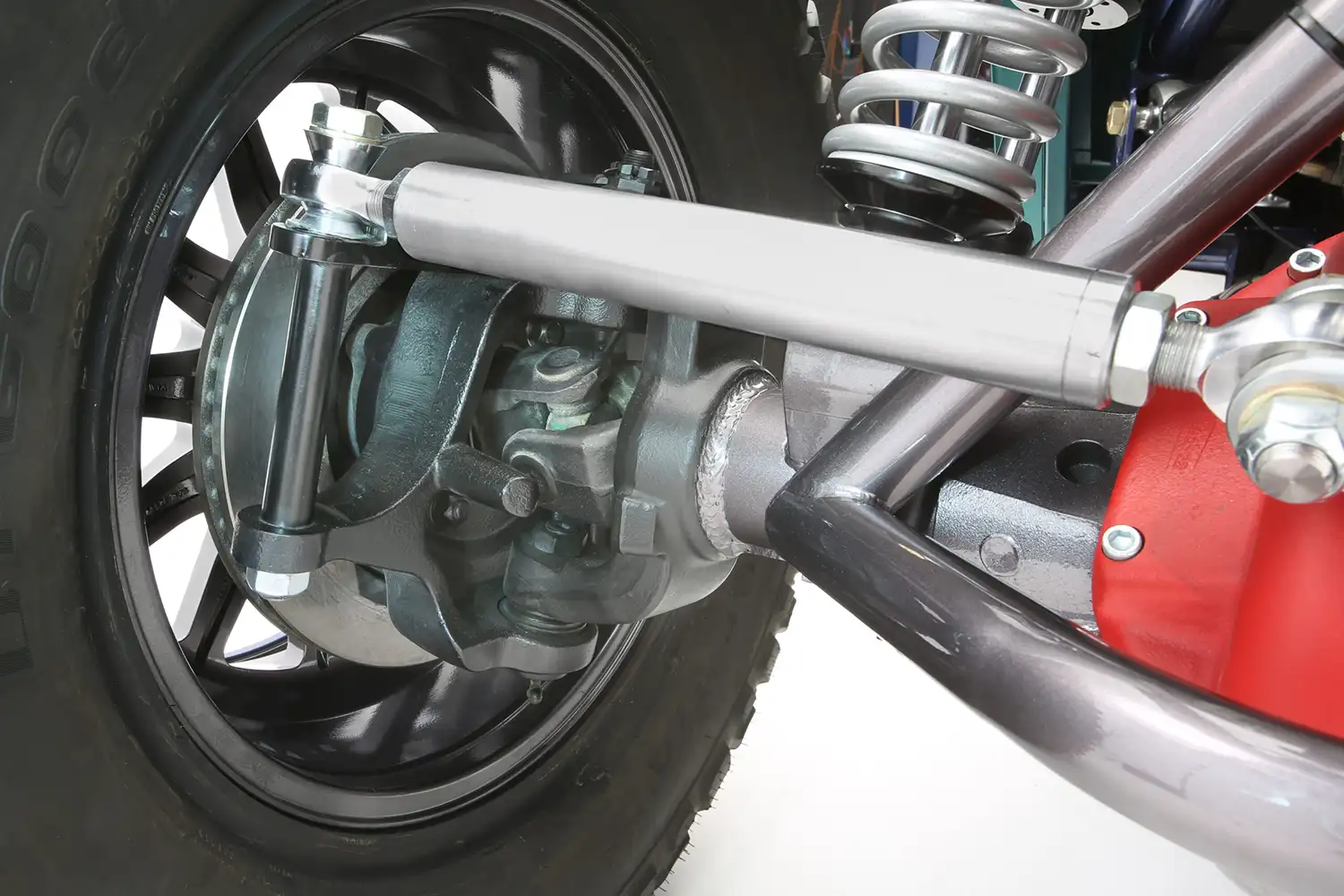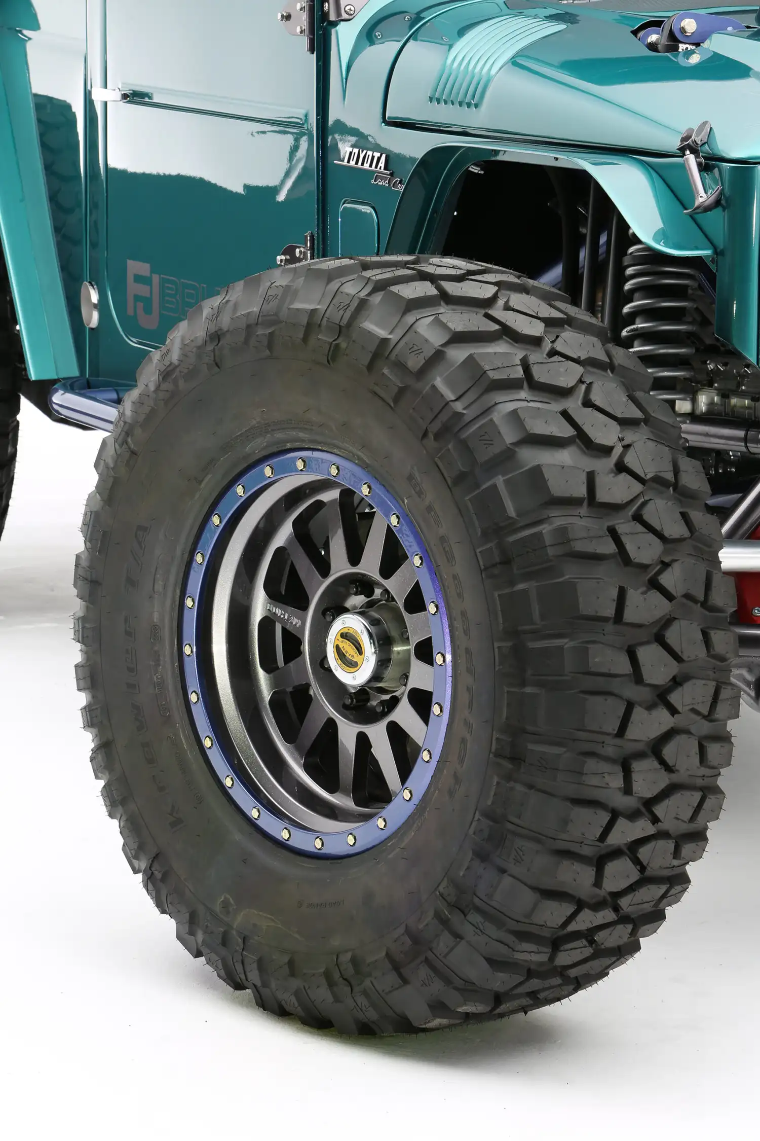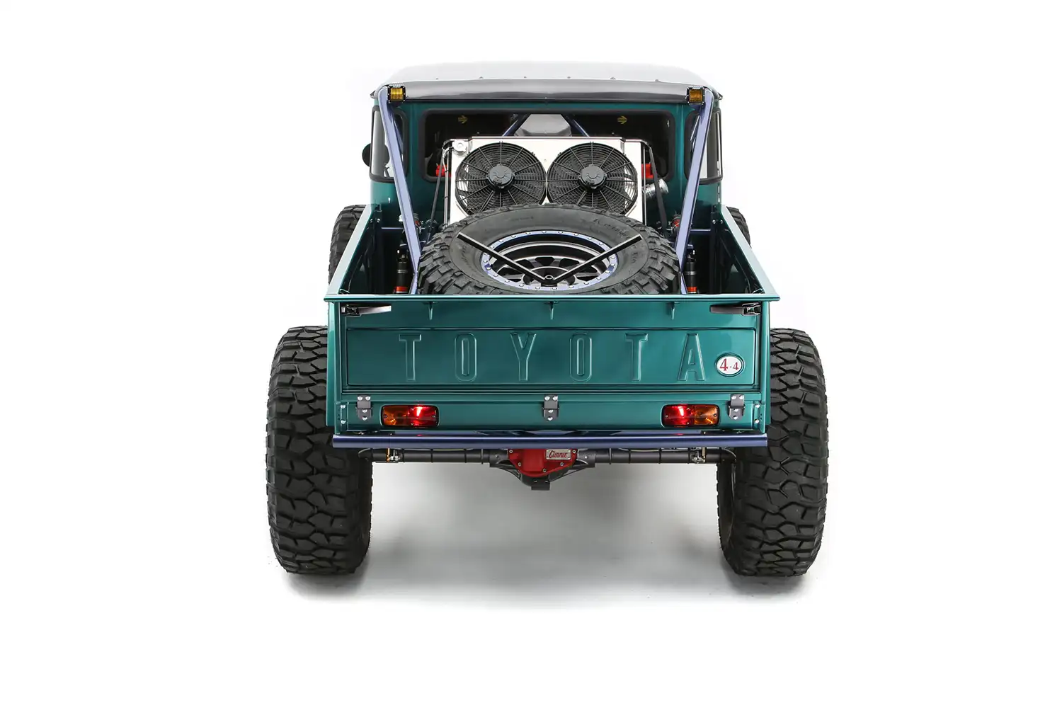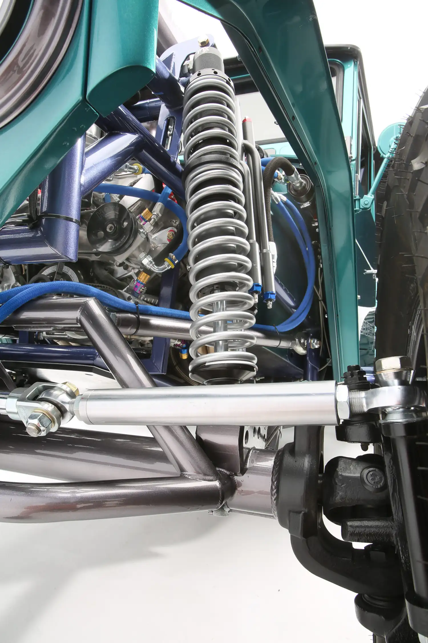 In true old school brawn fashion, FJ Bruiser remains a solid axle vehicle. Purpose built with “unstoppable” as a stipulation on its build sheet, the driveline features front and rear Currie® differentials and an Advanced Adapter Atlas® transfer case that provides four 2WD speeds and four 4WD speeds. The drivetrain setup allows the FJ Bruiser to crawl at 12 mph revving to 7,000 rpm in the lowest gear and reach speeds of up to 165 mph at that same 7,000 rpm engine speed in highest gear.