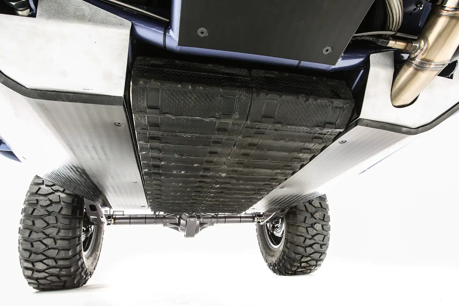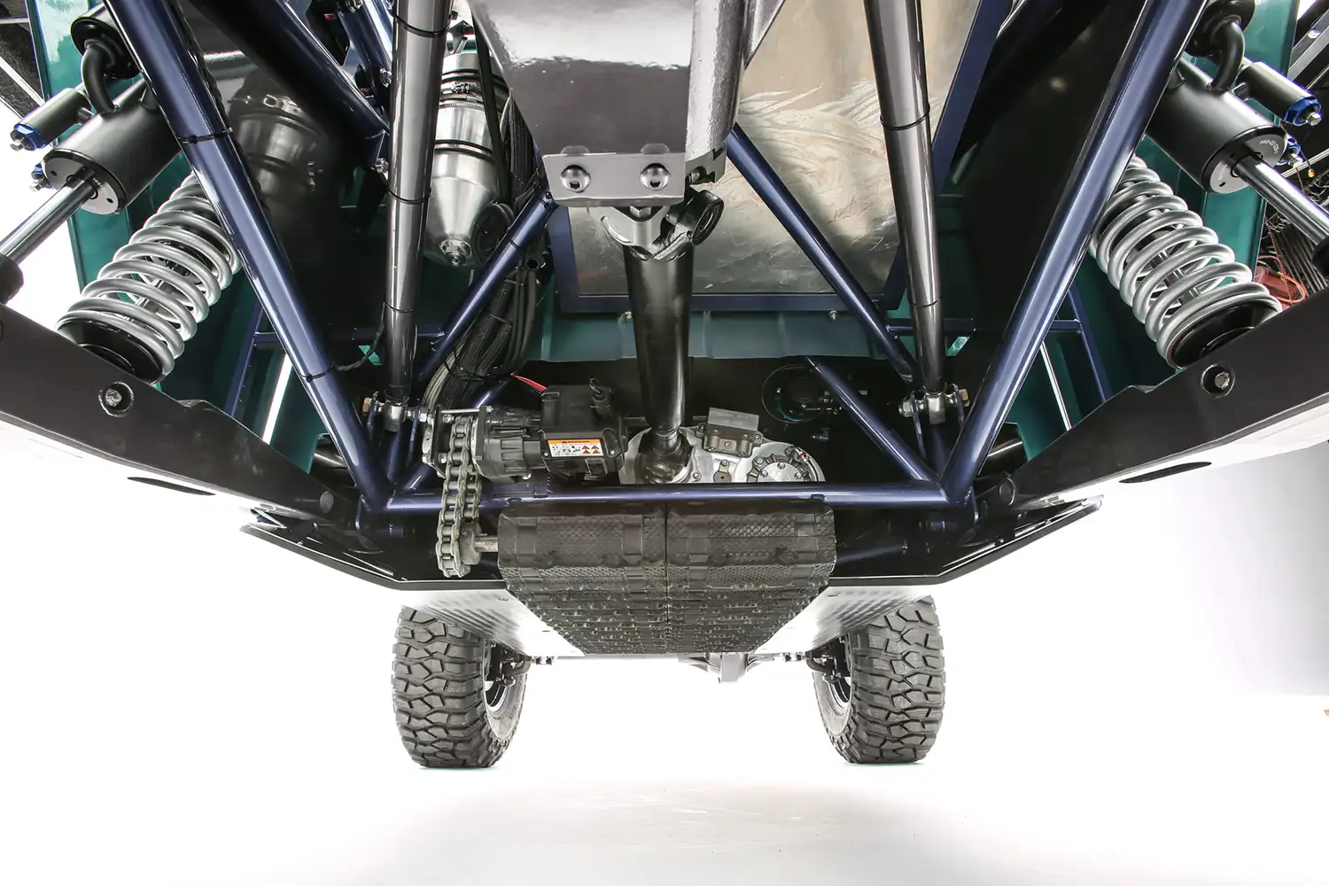 Should ground clearance ever become an issue, the team replaced the center skid plate with a tank-like track system that can be used to power out of any high centered situation. The CAMSO® track is controlled from the cockpit, so the driver can stay securely seated; no need to unstrap and find something to tie off the winch. Tank mode can be activated with the push of a button.