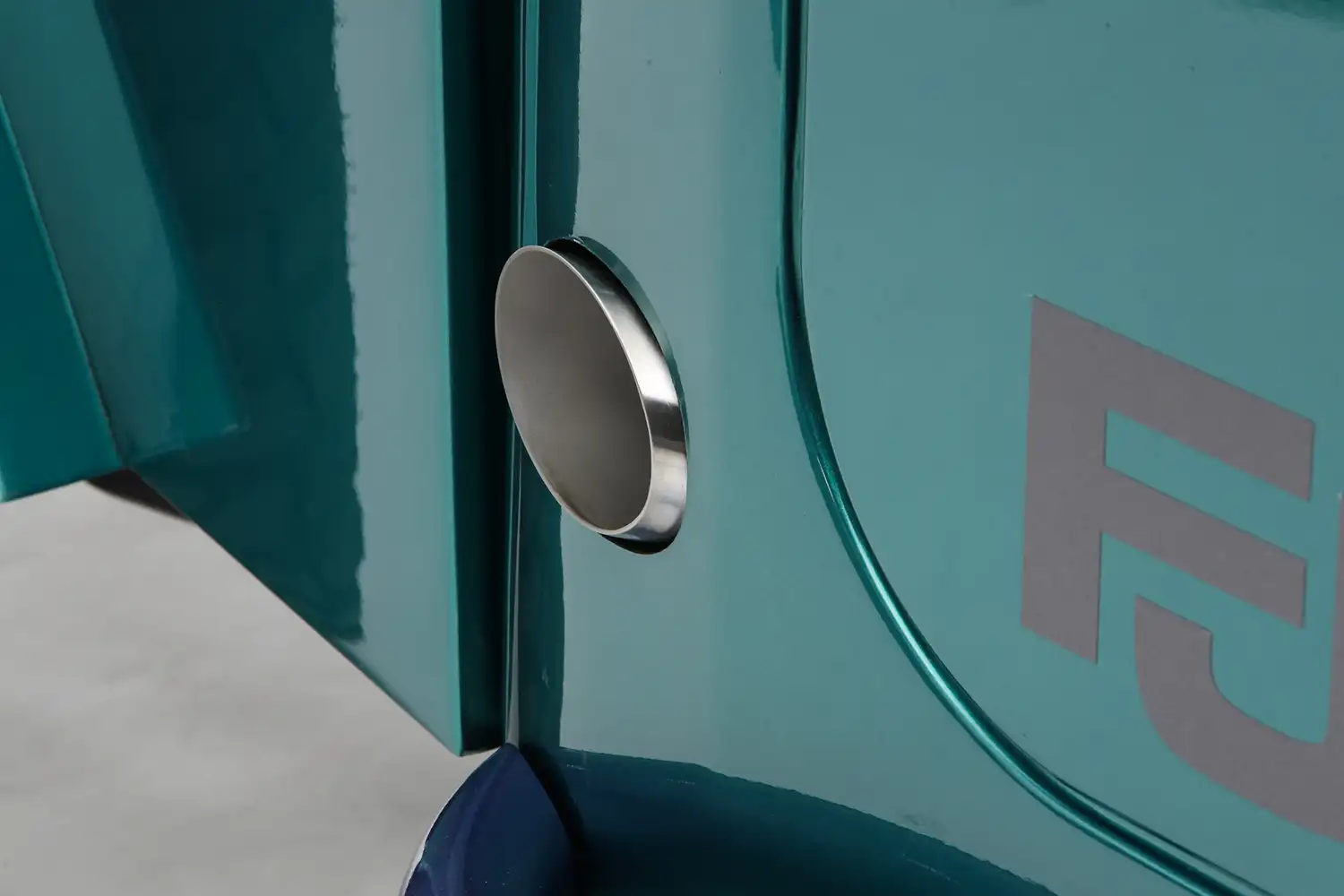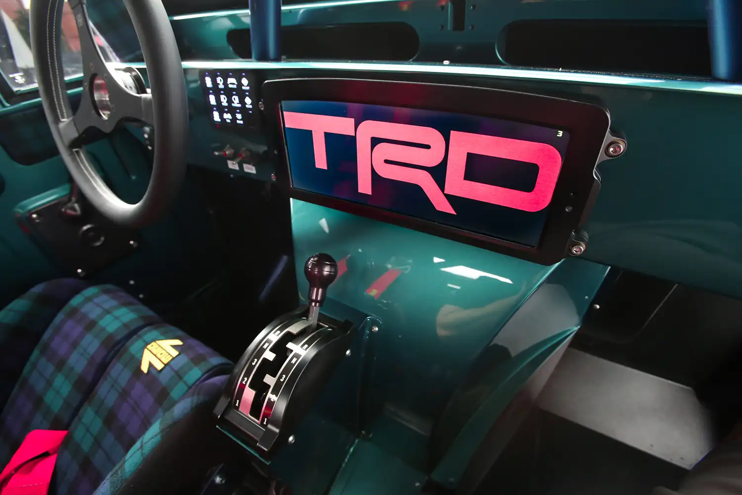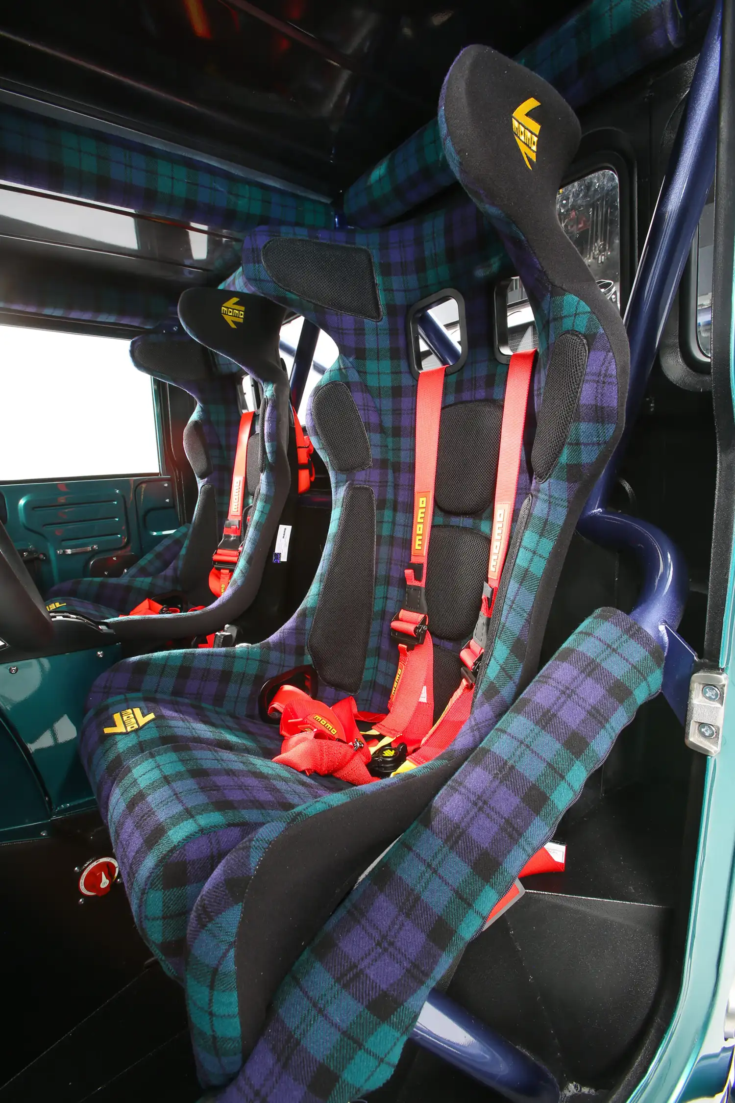Moving inside, Complete Customs® worked with the team to outfit the interior. MOMO® Daytona EVO seats were reskinned in paint scheme-colored plaid, an homage to the FJ’s original plaid bench seat, along with a vintage 1968 Jackie Stewart championship steering wheel.