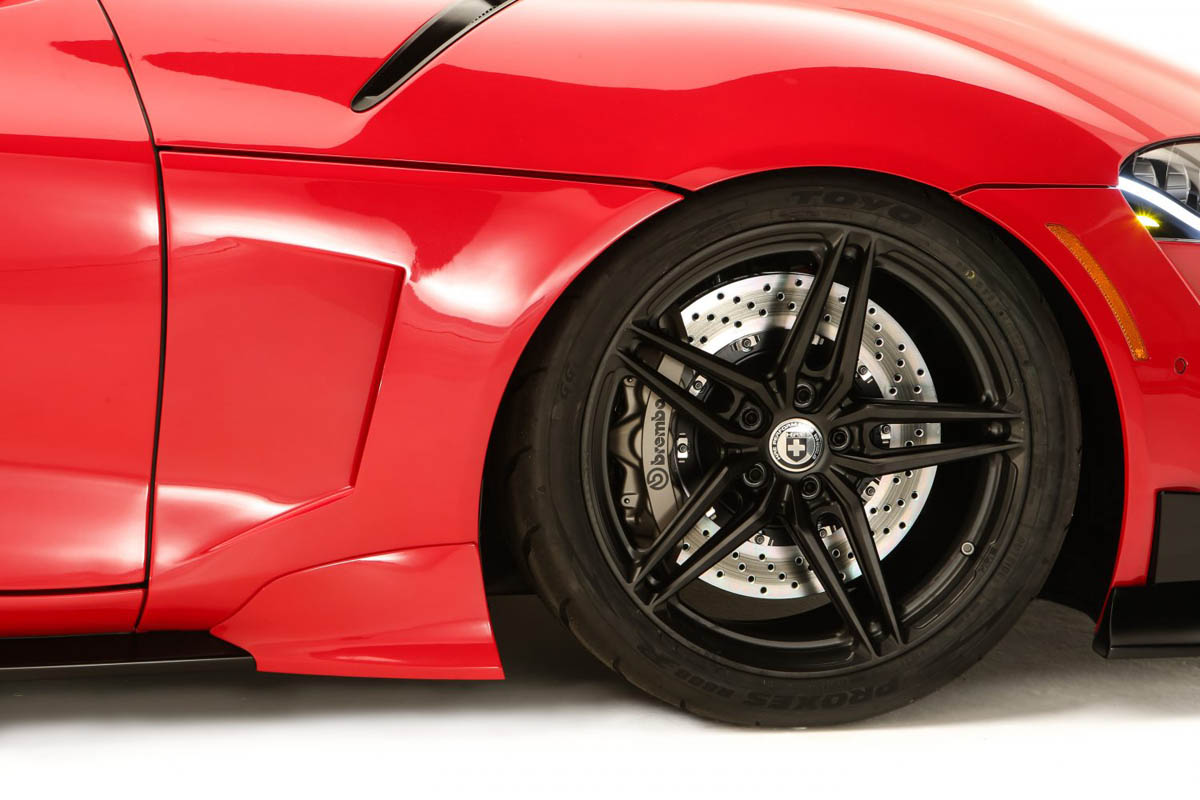 Toyota worked with Scarbo Performance to design an extremely unique custom inboard rocker arm system to replace the factory rear suspension. This allowed the team to maintain the factory body lines while creating room for a wider wheel and tire combination capable of managing the increased horsepower. The GR Supra Heritage Edition wears custom 19×11-inch HRE P107SC five-spoke wheels shod with 305/30R19 Toyo Proxes R888R competition tires at the rear. A matching set of 19×10.5-inch HRE P107SC wheels with 295/30R19 Toyo Proxes tires fill the front wheel wells.
