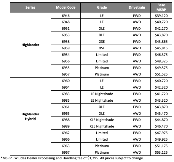 2024 Highlander Pricing*