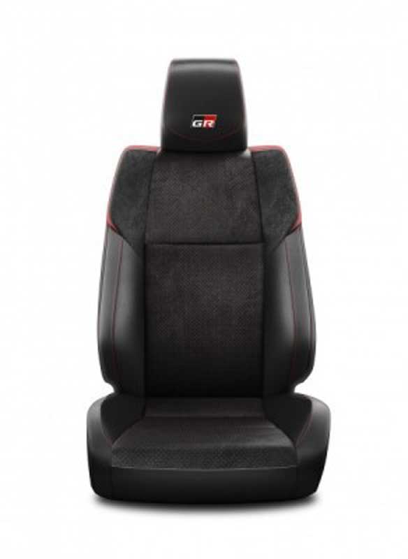 In the cabin there are new sports front seats in a combination of black leather and synthetic suede with red perforations and contrast stitching. The GR SPORT branding is featured on the seatbacks, carpet mats, starter button and the information display animation graphic. The driver can use paddle controls for manual shift selection and aluminium sports pedals are fitted. The look is enhanced with carbon fibre-style trim inserts, a red deco line across the width of the instrument panel and blue door panel illumination.