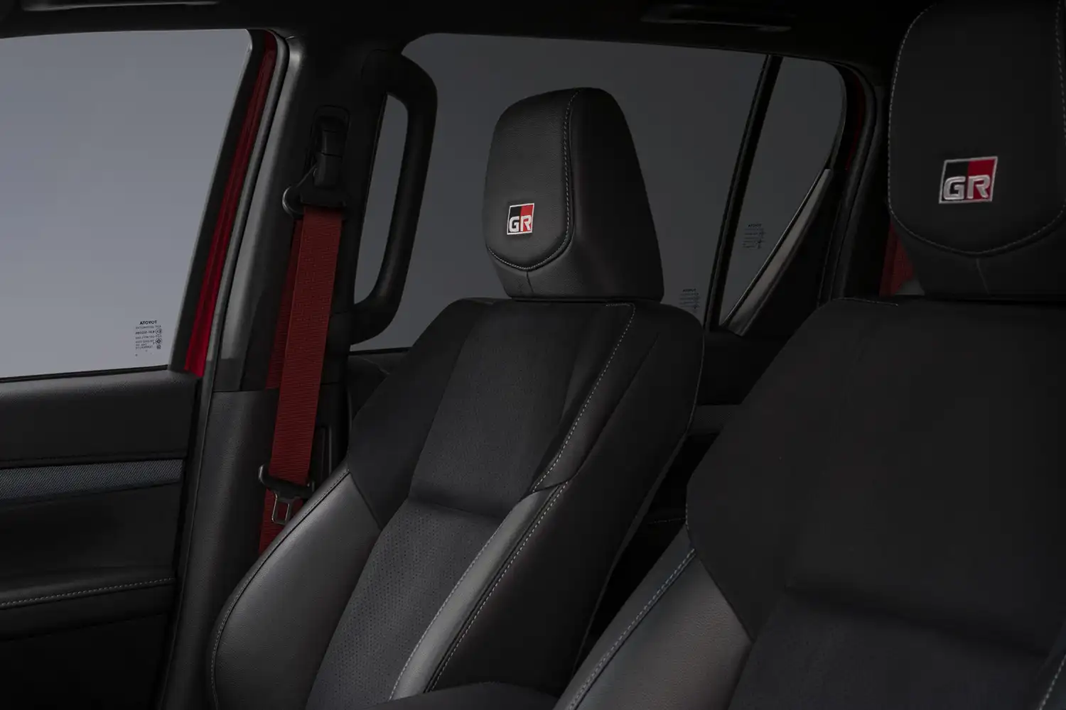 The cabin complements the strong design with a stylish black monochrome theme with bold red accents. Red seatbelts, paddle shifts and aluminium pedals reference the GR Sport’s motorsport influence.