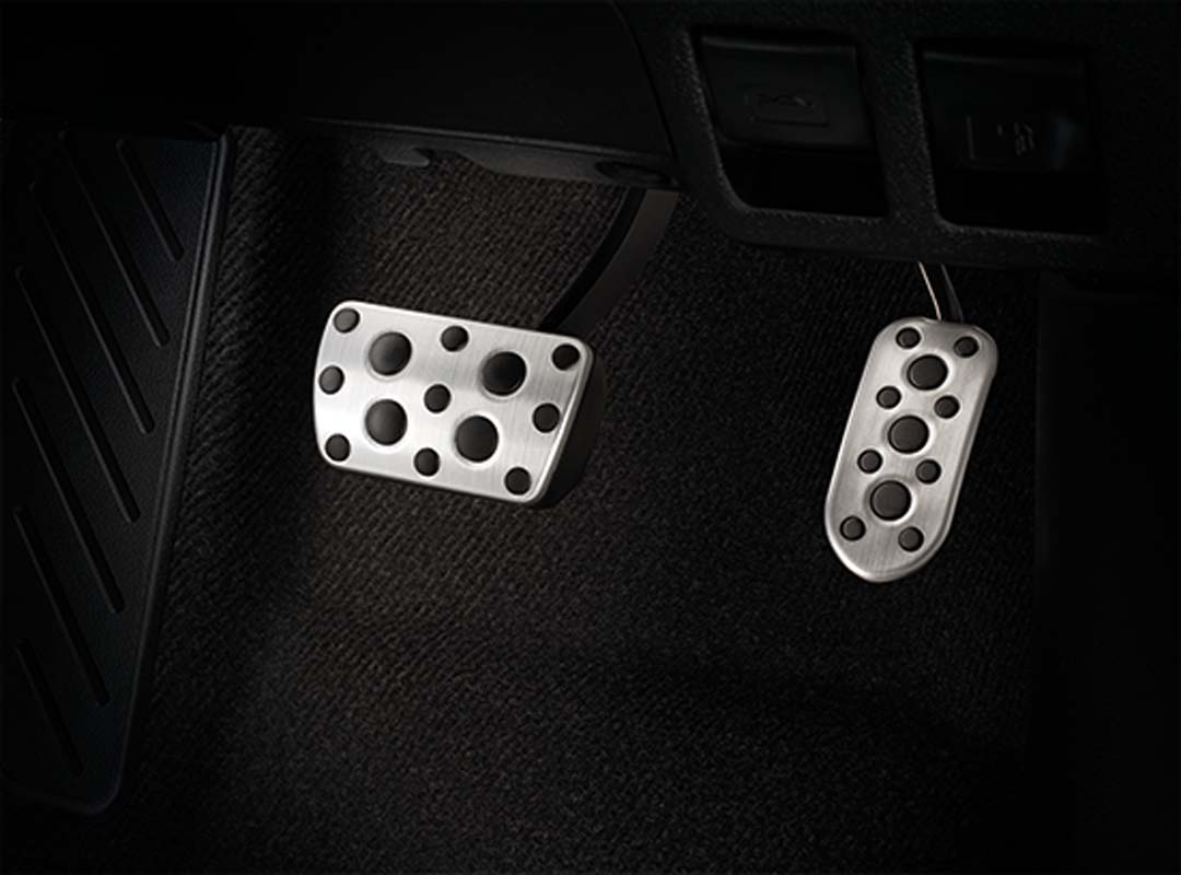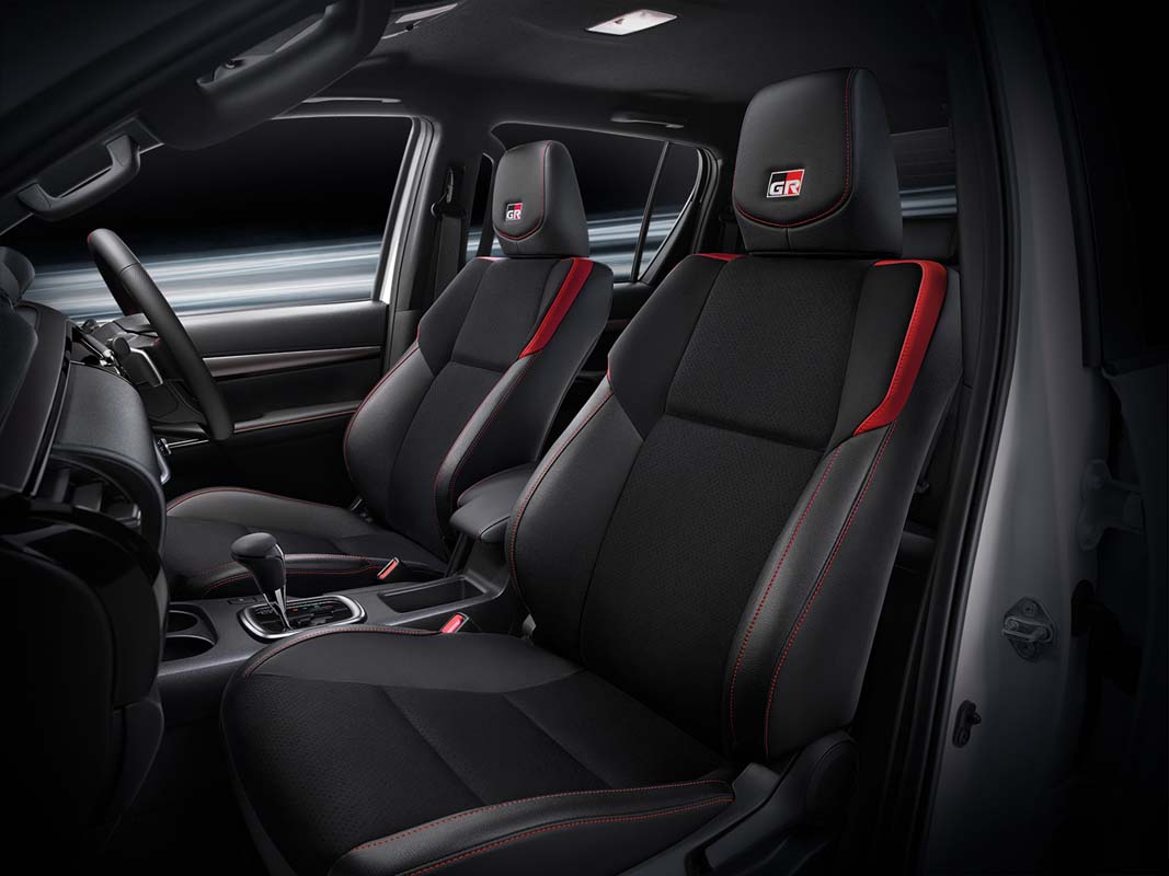 – Sports car upholstery combined with Perforated suede, decorated with red thread stitching and the GR emblem.