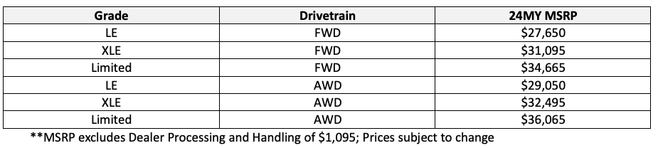 The 2024 Prius will be available in a choice of six colors, including Wind Chill Pearl, Cutting Edge, Guardian Gray, Midnight Black Metallic, Supersonic Red or Reservoir Blue. The Manufacturer’s Suggested Retail Price, excluding Dealer Processing and Handling, will start at $27,650 for the LE grade. 2024 Toyota Prius models are expected to start arriving at Toyota Dealerships in November 2023.