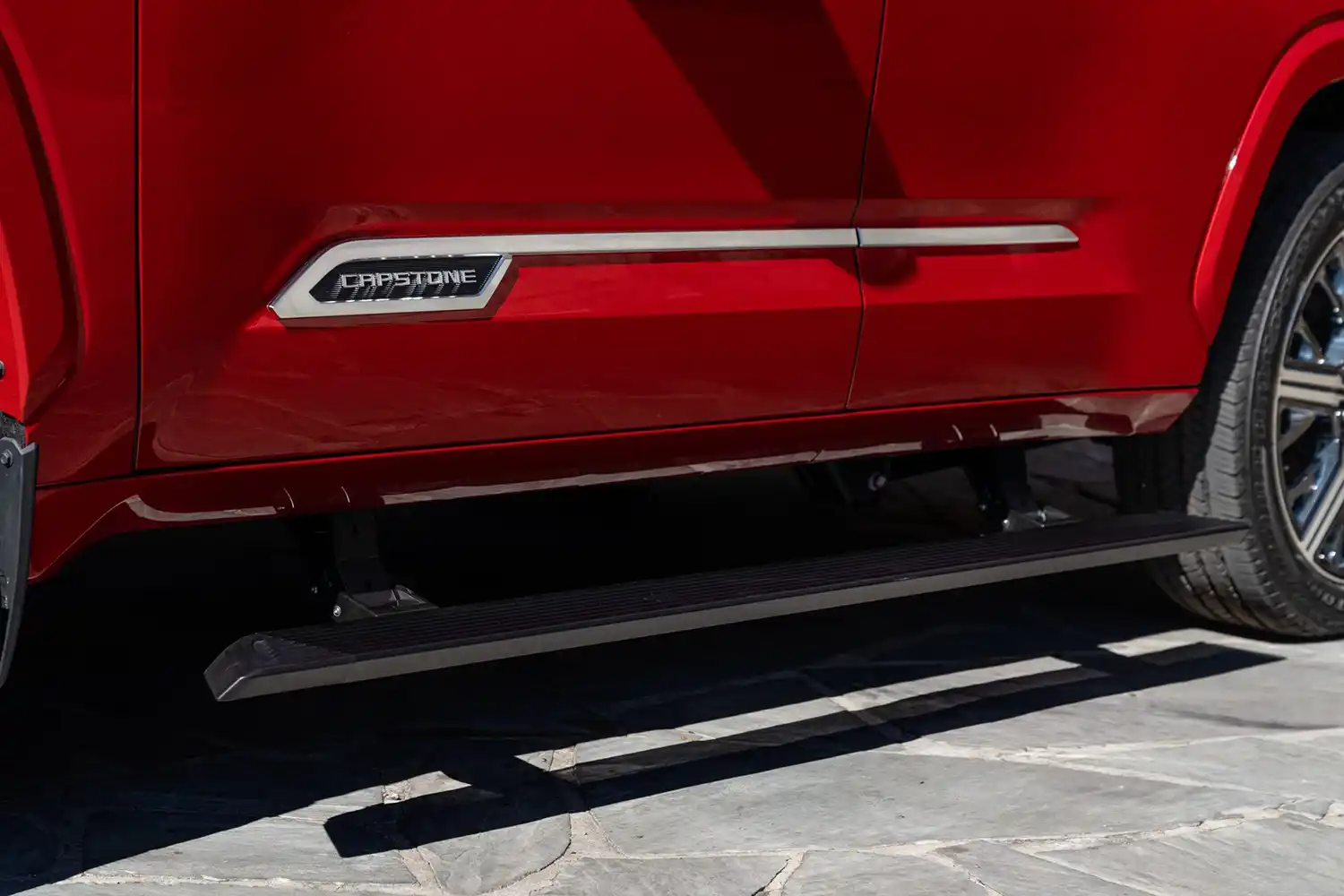 The Capstone grade sits atop the Sequoia lineup, building upon the great features of Platinum while adding additional top-shelf features to make it the most luxurious Sequoia to date. Capstone features unique chrome accents to provide an upscale appearance, with the most eye-catching feature being the standard 22-inch chrome wheels – a first for Sequoia and exclusive to Capstone. The premium cabin experience begins at the first step with standard power running boards that provide access to the standard semi-aniline leather-trimmed seats. Not only are the seats luxury-grade, but they also tout stylish perforation and a Capstone-exclusive black-and-white color combination. The center console and passenger-side dash are accented with authentic American Walnut with an open-pore finish that highlights the wood grain. On the dash, the Walnut pieces surround a Capstone logo that is accentuated with LED mood lighting when the doors are opened. To help provide an even quieter cabin, Capstone is the only Sequoia grade to feature acoustic glass in the front doors for more exterior sound deadening.