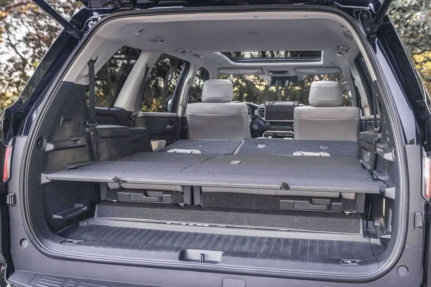 The three-row SUV offers a range of configurations for seating and cargo. Depending upon the grade, second-row passengers get bench seating or captain’s chairs, either of which recline for passenger comfort or fold down/tumble forward if larger cargo space is needed. The third-row passengers benefit from a spacious reclining backseat with available power folding, but the third row also gets one of the most noteworthy features on Sequoia: the exclusive Sliding Third Row with Adjustable Cargo Shelf System. This segment-first feature allows the third row to slide with 6 inches of adjustment range. The third row can also fold down to complement the different storage positions of the new Adjustable Cargo Shelf System: a removeable shelf that can be set in a variety of storage positions depending upon the situation. The Cargo Shelf System is designed to offer the ultimate flexibility in rear cargo and storage needs.