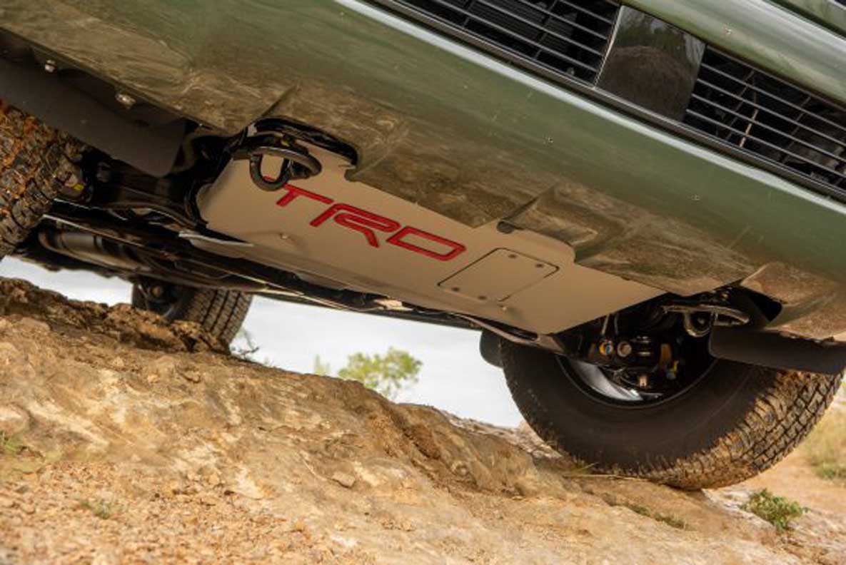 In addition to TRD Pro-exclusive Army Green, other exterior color choices include Super White, Midnight Black Metallic and Magnetic Gray Metallic. Whichever color is chosen, black TRD Pro front door badges quickly identify this special model. A TRD front skid plate helps protect the front suspension and oil pan during trail driving, while cast aluminum running boards and a roof rack enhance function, convenience and the adventurous attitude.