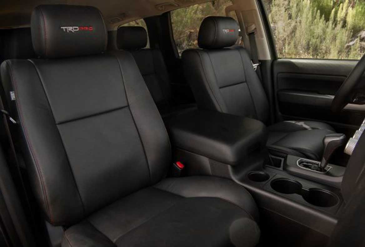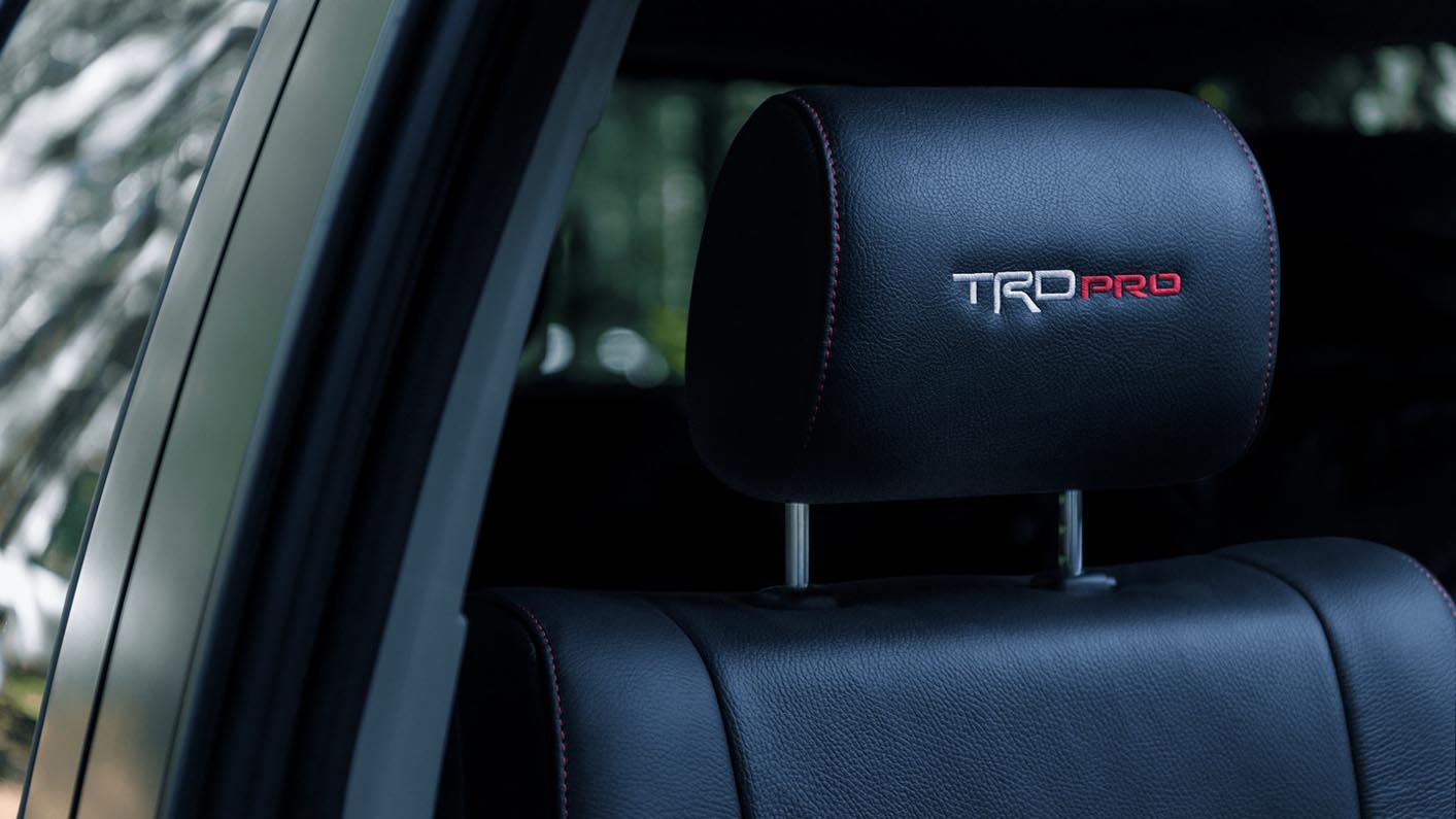 The TRD Pro cabin treatment mixes ready-to-get-dirty function with luxury, because there’s nothing wrong with a little comfort out on the trail. Black TRD Pro leather-trimmed seats with red contrast stitching and “TRD Pro” stitched into the front headrests are comfortable and durable, while TRD Pro all-weather floor mats add bring-it-on cabin protection.
