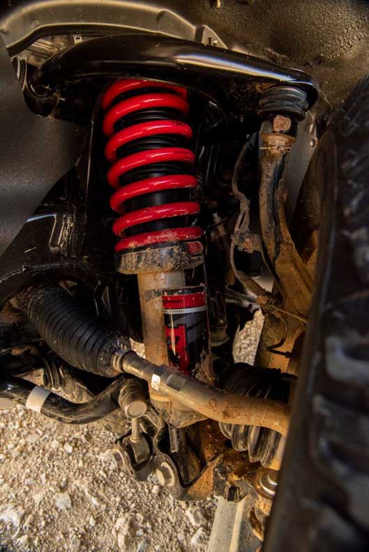 Compared to external-bypass shocks used on off-road race vehicles, the Fox internal bypass shock compactly integrates bypass zones inside the shock body, which allows the shock’s fluid to bypass the piston through regulated ports as it moves through its travel. Providing a cushioned ride during typical driving, the Fox shock damping gets progressively firmer through the shock piston’s stroke to resist bottoming over rough trail surfaces.