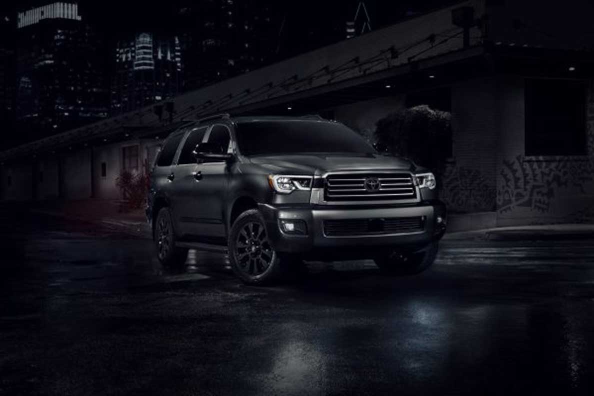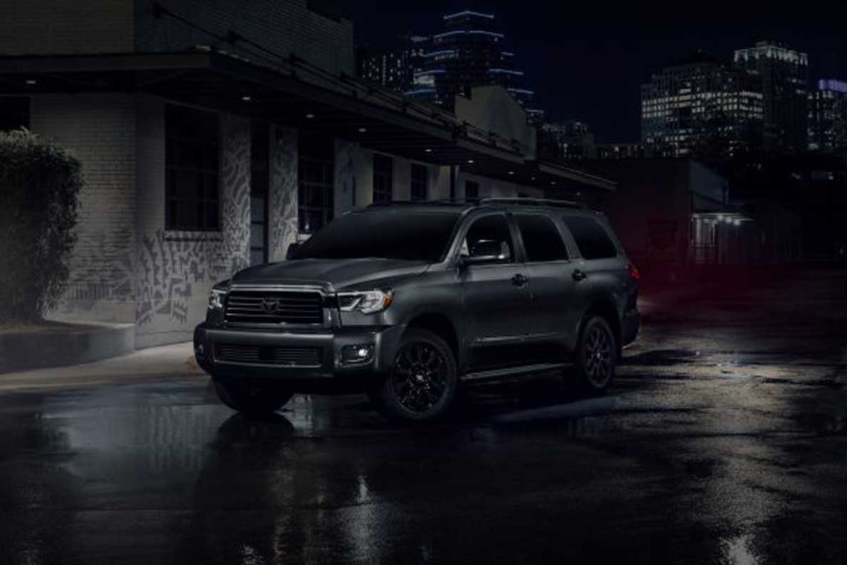 The 2021 Sequoia Nightshade Edition gives off a custom vibe with darkened chrome grille, lower grille surround, body side moldings, fog light surrounds and Sequoia badges. Black mirror caps, door handles, and 20-inch black split-spoke alloy wheels complete the exterior makeover. Guests can choose between Midnight Black Metallic, Magnetic Gray Metallic, or Blizzard Pearl exterior colors. Black leather-trimmed seating surfaces comes standard on the Nightshade Edition.