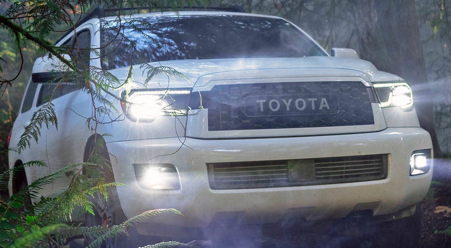One could never lose the 2020 Toyota Sequoia TRD Pro in the parking lot of an outdoor gear store. The TRD Pro “TOYOTA” grille leads the charge, flanked by LED headlights and, below, Rigid LED fog lights. The Sequoia TRD Pro rolls on TRD 18 x 8-in. black BBS forged aluminum wheels wearing P275/65 R18 tires.