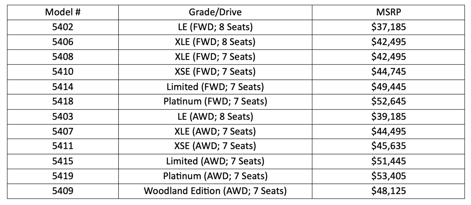 The Limited and Platinum grades have no packages but do offer two factory options: Digital Rearview Mirror and a 1080p HD Entertainment Center with 11.6-in. display, HDMI input, remote control and two wireless headphones (also optional on XLE and XSE). A 1,500-watt inverter with 120V AC outlet is also available for the XLE grade and above and could help power household items during a power outage. A spare tire and the power inverter are also available on Limited and Platinum.