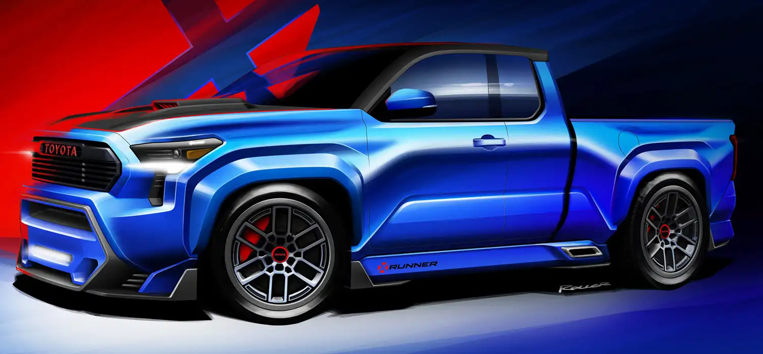 A concepting session between the Toyota Engineering teams at Toyota R&D and design team at Toyota’s famous Calty Design Studio in Ann Arbor, Michigan, resulted in a divergence from the off-road focus at the 2023 SEMA Show. The brainstorming sessions pointed to a street truck build, a modernized X-Runner Concept, based on the all-new 2024 Toyota Tacoma.