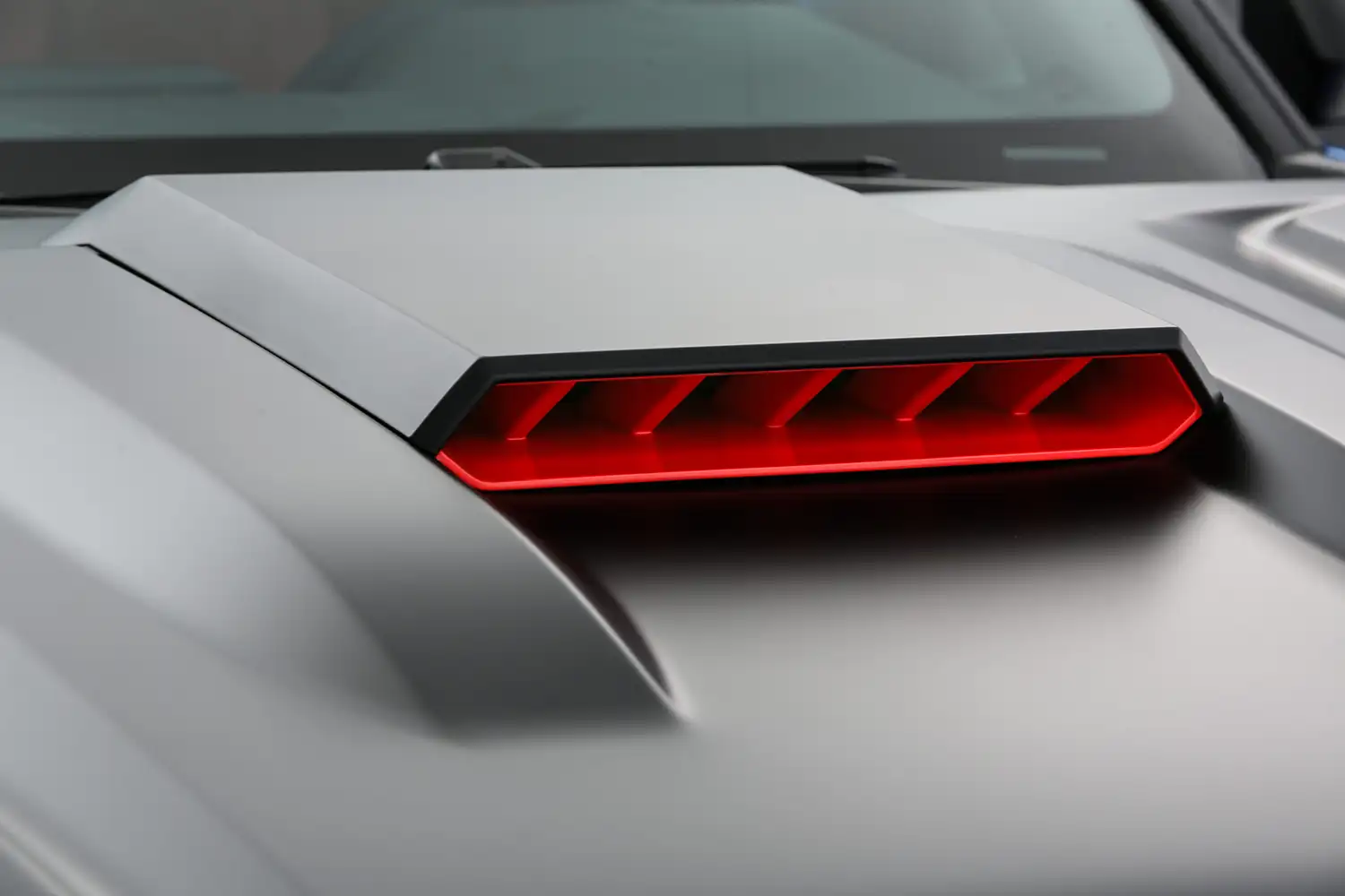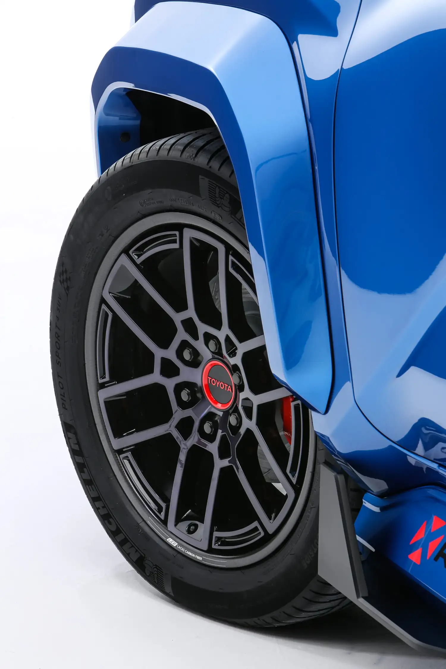 To achieve a proper street stance and further demonstrate the TGNA-F platform flexibility, the team sourced a Tundra air-suspension to attain the lowest possible ride while still carrying a load. Up front, the upper and lower arms were lengthened to match the Tundra’s suspension geometry. The lower arm was customized with the slammed nature of the vehicle in mind. At the rear, the upper and lower arm lengths were also increased to mate with Tundra’s rear axle housing, axle shafts and bearings, matching the width and strength of the front end. To enhance Tacoma’s already impressive on-road driving dynamics, its springs were stiffened, optimizing performance with a set of custom-valved, 2.5-inch Bilstein® aluminum bodied shocks with remote reservoirs at each corner to help the driver put all 421 horsepower to the ground. Finally, the wheel wells were filled with Lacks Enterprises®, one-off, 21×9.5-inch carbon fiber wheels with forged aluminum centers on Michelin 285/45R21 Sport Tires.