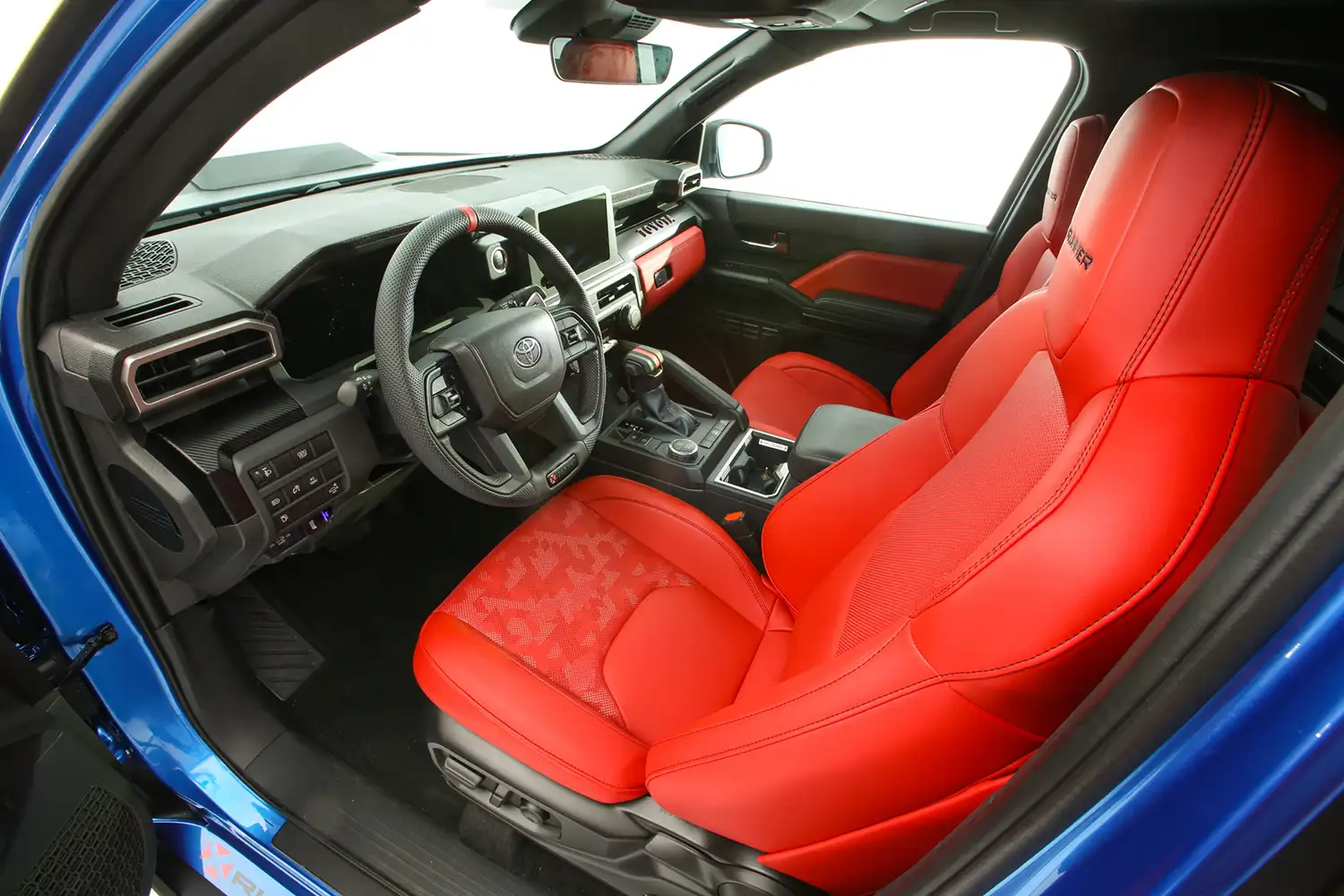 Most of the body was sprayed in the original Speedway Blue color as a subtle nod to the original X-Runner that debuted the distinctive hue when it was introduced at the 2004 Chicago Auto Show. A matte black finish on the hood, A-pillars and roof take cues from the TRD Pro style guide, while red accents complementing the hood lines, scoop and wheel hubs signal that this is a high-performance street machine.