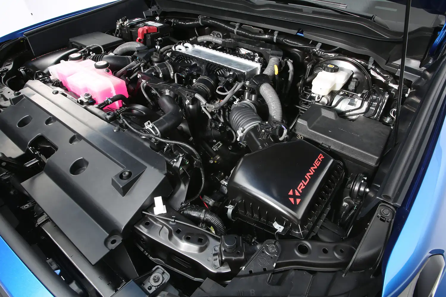 The X-Runner Concept benefits from a modified i-FORCE 3.4-liter twin-turbocharged V6 producing 421 horsepower with 479 lb-ft of peak torque. A Tundra solid axle with 4.30:1 final drive and an electronic locking differential splits the torque to the rear wheels, while a custom side exhaust exits just below the rocker panel.