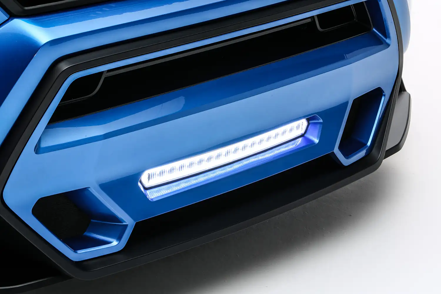 To support the chassis modifications and engine, the overall track width was increased by just over 3 inches and the frame was strengthened. When it came to styling, the team made a point to maintain the Tacoma’s design language, including the use of interlocking shapes and fluid forms central to its “chiseled liquid” DNA. The concept’s aggressive front fascia is completed with Tacoma XB LED Projector headlights with “X-Runner” laser ablation lenses. Front and side body work features custom aero-fairings with functional venting that cools X-Runner’s 13.9-inch Tundra front brakes, providing higher heat capacity. The functional hood scoop is purpose-built as well, drawing cool air into the engine bay. From the back, X-Runner is purposefully simple, its look punctuated by smoked taillights.