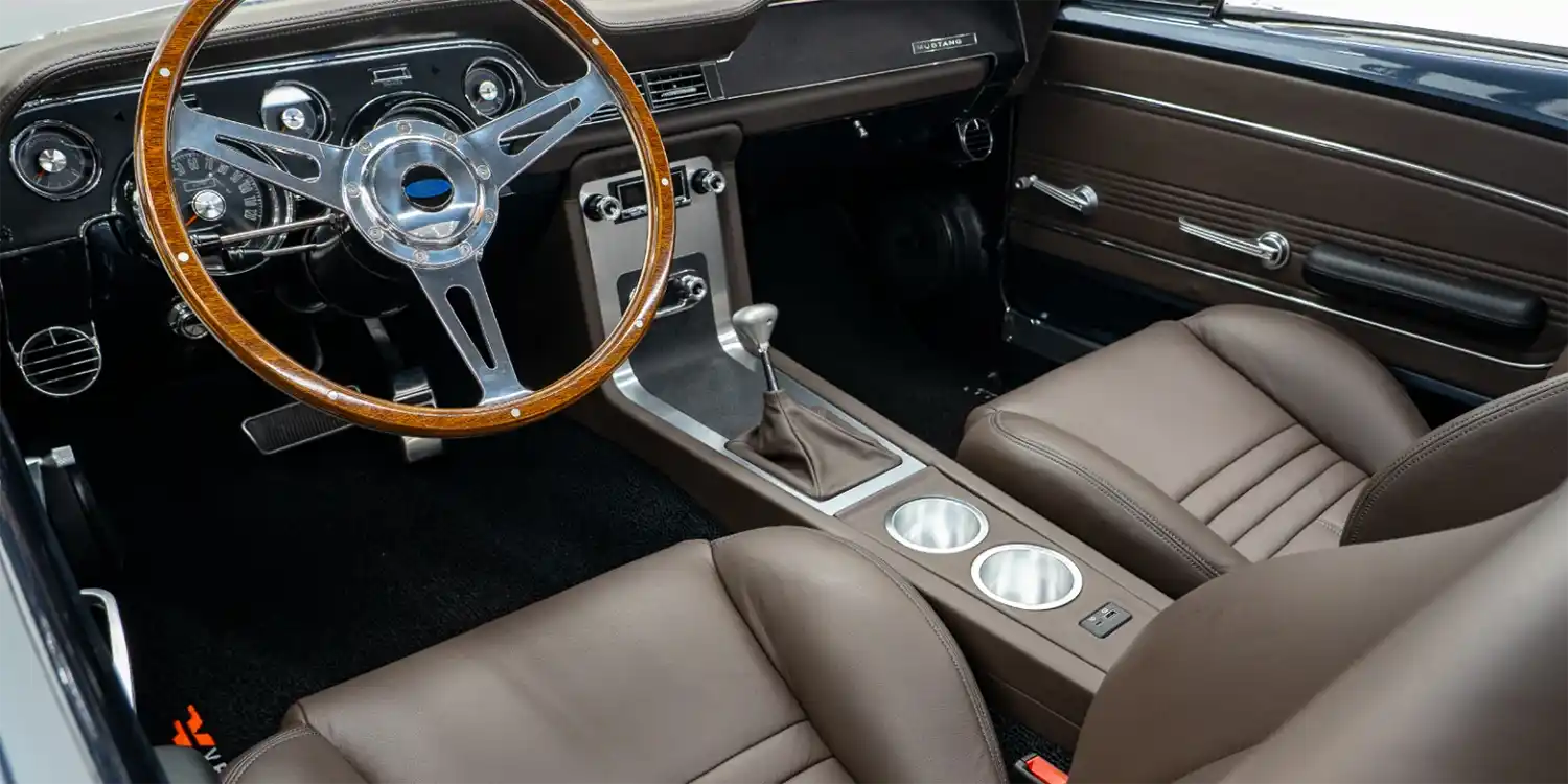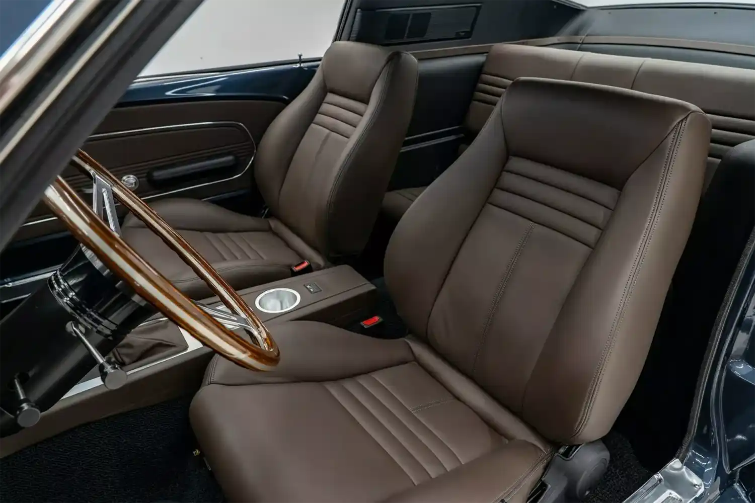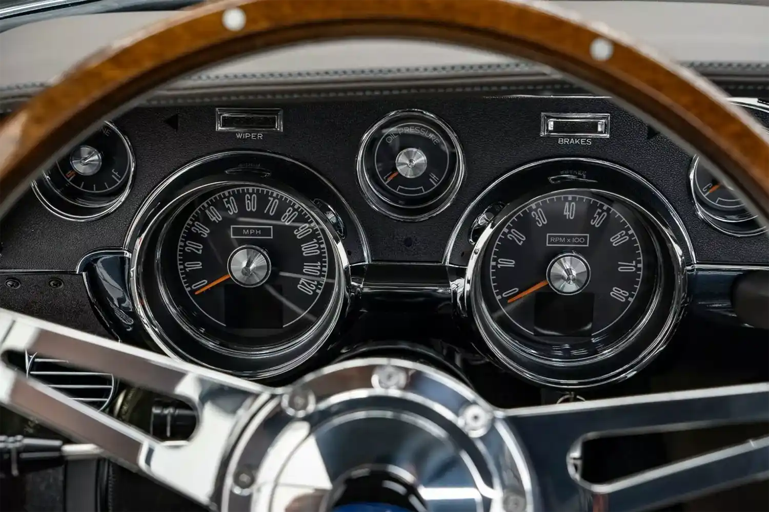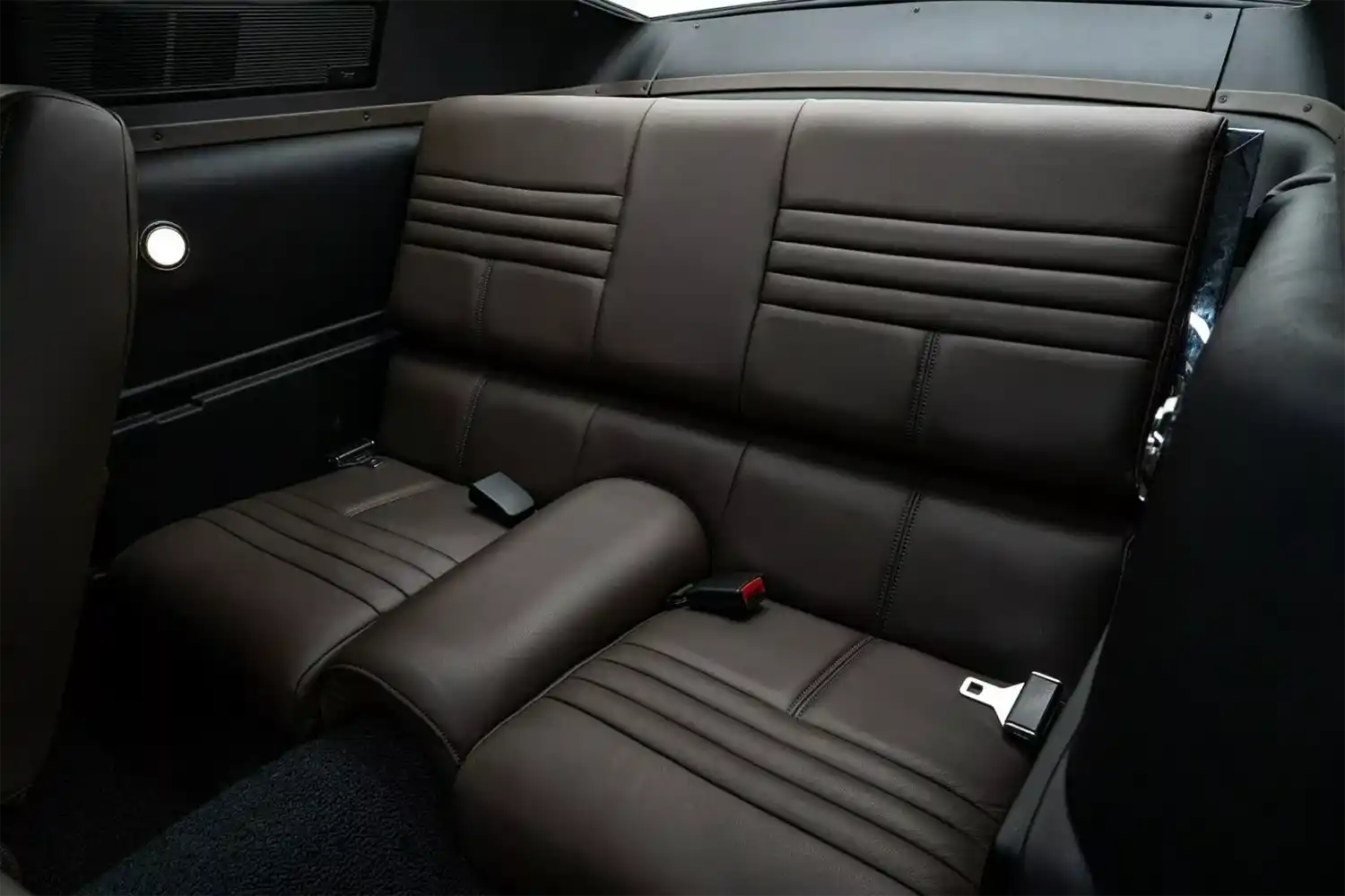 Inside the Fastback, Velocity’s in-house design team has crafted a luxurious cockpit filled with both nostalgia and modern comforts. Climate control comes courtesy of the Vintage Air air-conditioning system. A RetroSound head unit cranks tunes through four Focal speakers and a subwoofer for immersive audio.