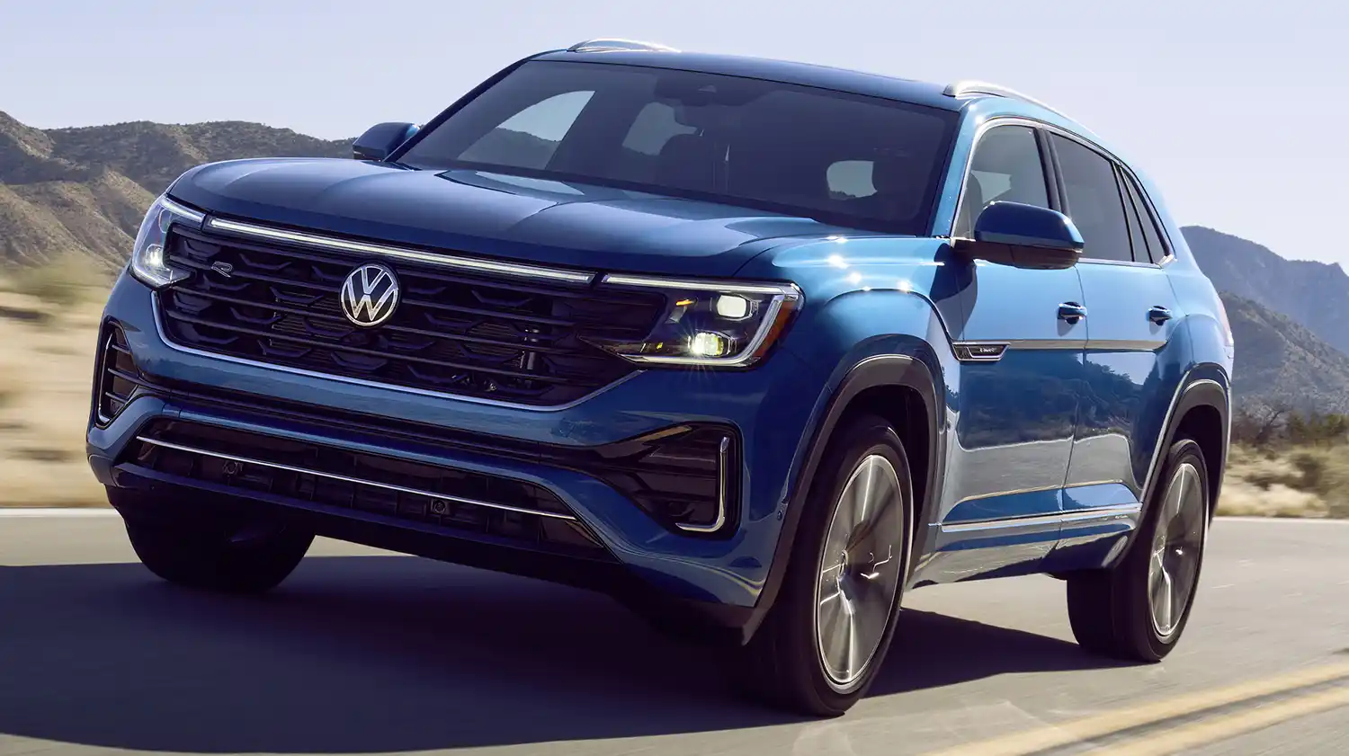 Outside, model year 2024 brings a new front end design and greater differentiation between Atlas and Atlas Cross Sport. On both cars, a wide chrome four-bar grille is framed by LED headlights with the newly standard Adaptive Front-lighting System (AFS). On all but base trims, the Daytime Running Lights (DRLs) wrap around the headlights and continue into an illuminated lightbar that sits atop of an illuminated VW logo, giving the vehicle an unmistakable premium look. A new front fascia with integrated air intakes completes the front end treatment. Atlas Cross Sport models feature gloss-black grille details and a gloss-black “X” design element stretching across the lower fascia, similar to Taos.