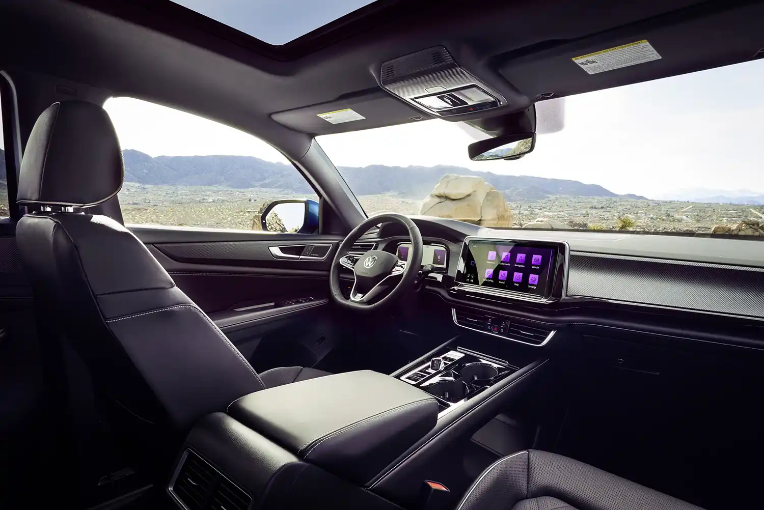 While the refreshed Volkswagen Atlas and Atlas Cross Sport maintain the same underpinnings of the successful outgoing models, the spacious interior of each vehicle receives a major upgrade for the 2024 model year. Premium materials are adopted throughout, including a leatherette-trimmed soft-touch dash and center console. Front-row door trim and décor flow seamlessly into the dash panel, creating an upscale cockpit; the door treatment is also mirrored in the second row. Available ambient lighting with 30 color choices pairs with innovative backlit dash décor featuring the model name to elevate the new design. Top-of-range models feature quilted leather seats with a diamond pattern.