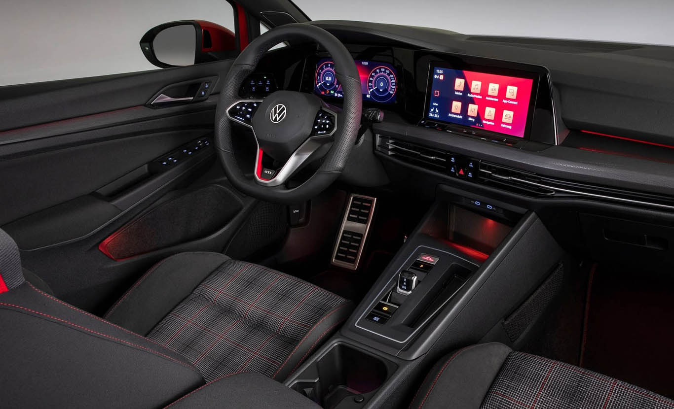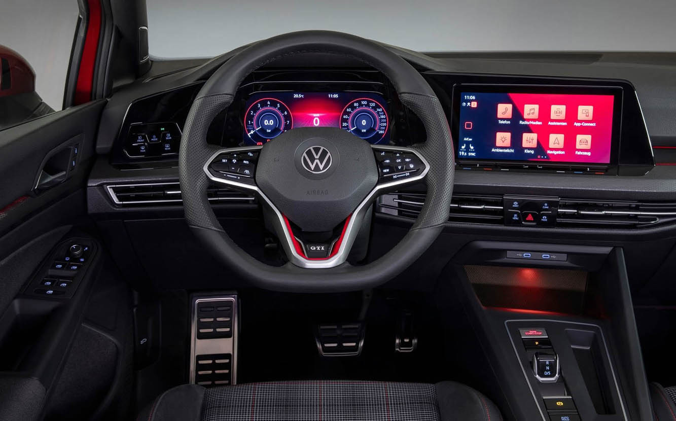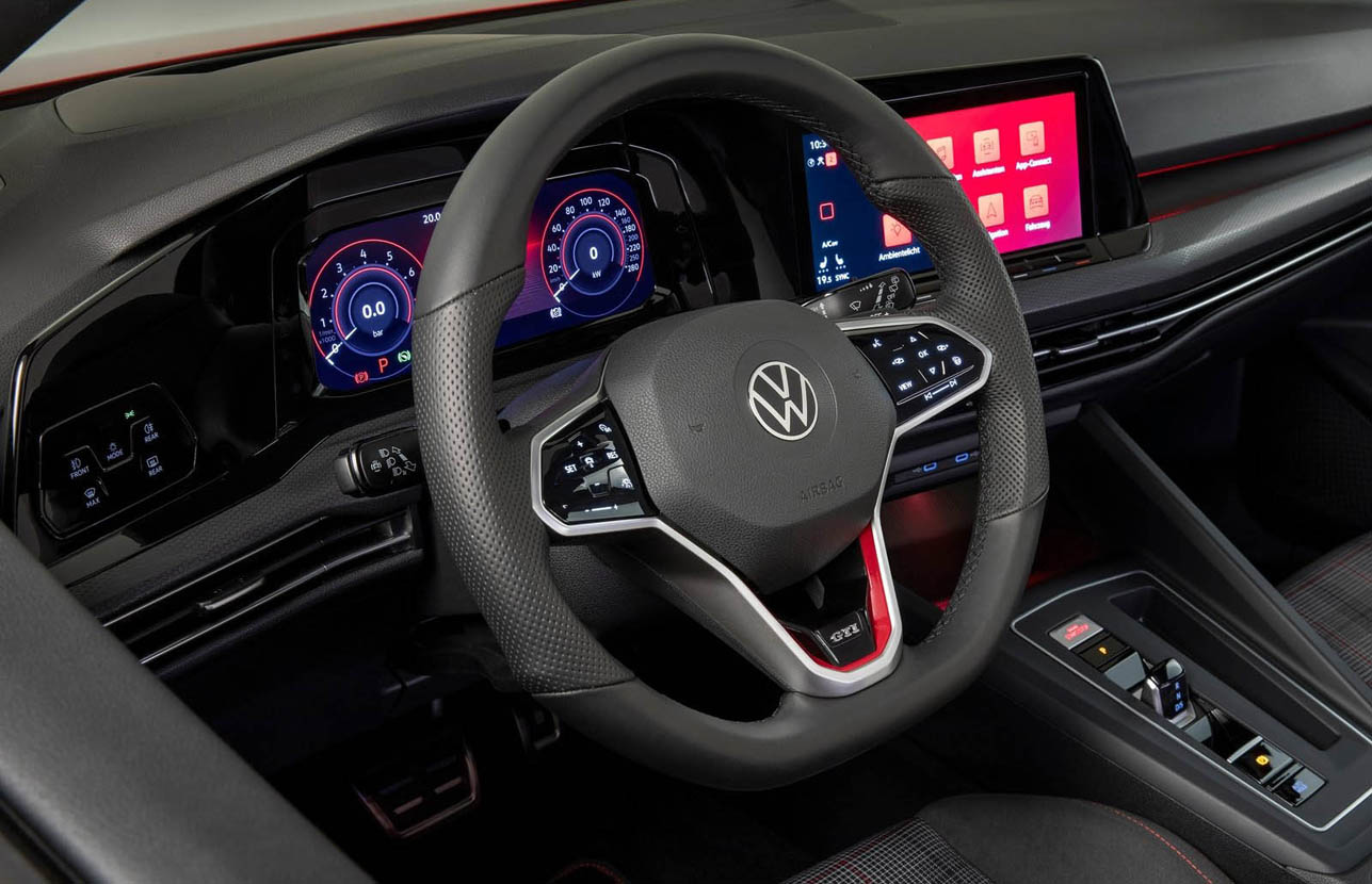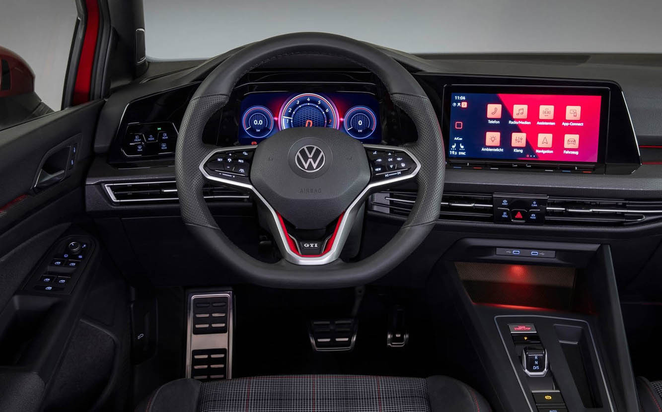 A new GTI graphics layout for the standard Digital Cockpit has been developed with an active info display and it can be opened using the new View button on the steering wheel. App-Connect and wireless charging are also standard.