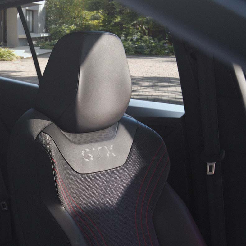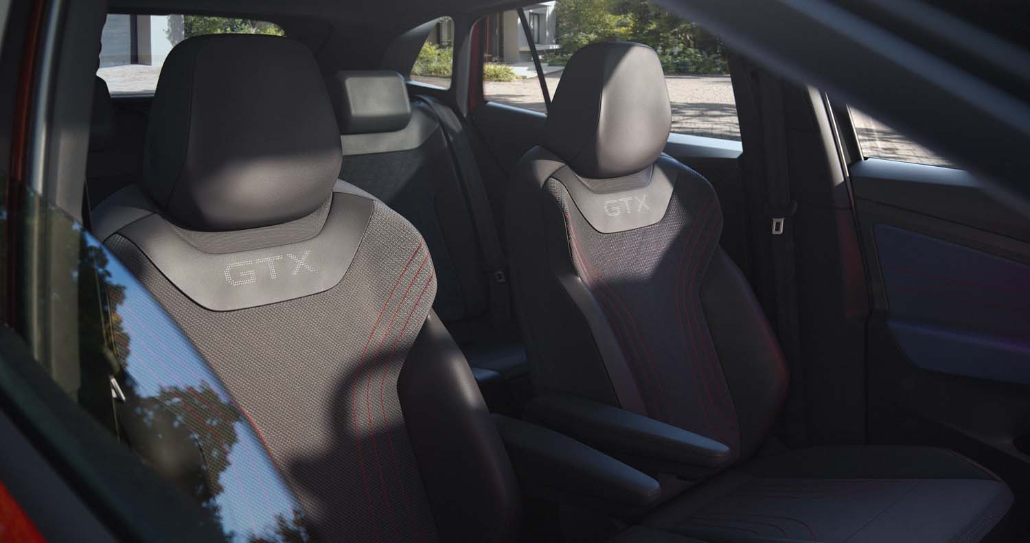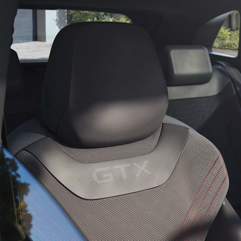 The upper section of the dashboard and leatherette inserts in the doors come in the dark shade of X-Blue, which represents sustainability. Red contrasting seams – a classic symbol for sportiness and strength – add accents to the seats. The GTX logo appears on the steering wheel, sill panel trims and – in perforated form – at the top of the front seat backrests.