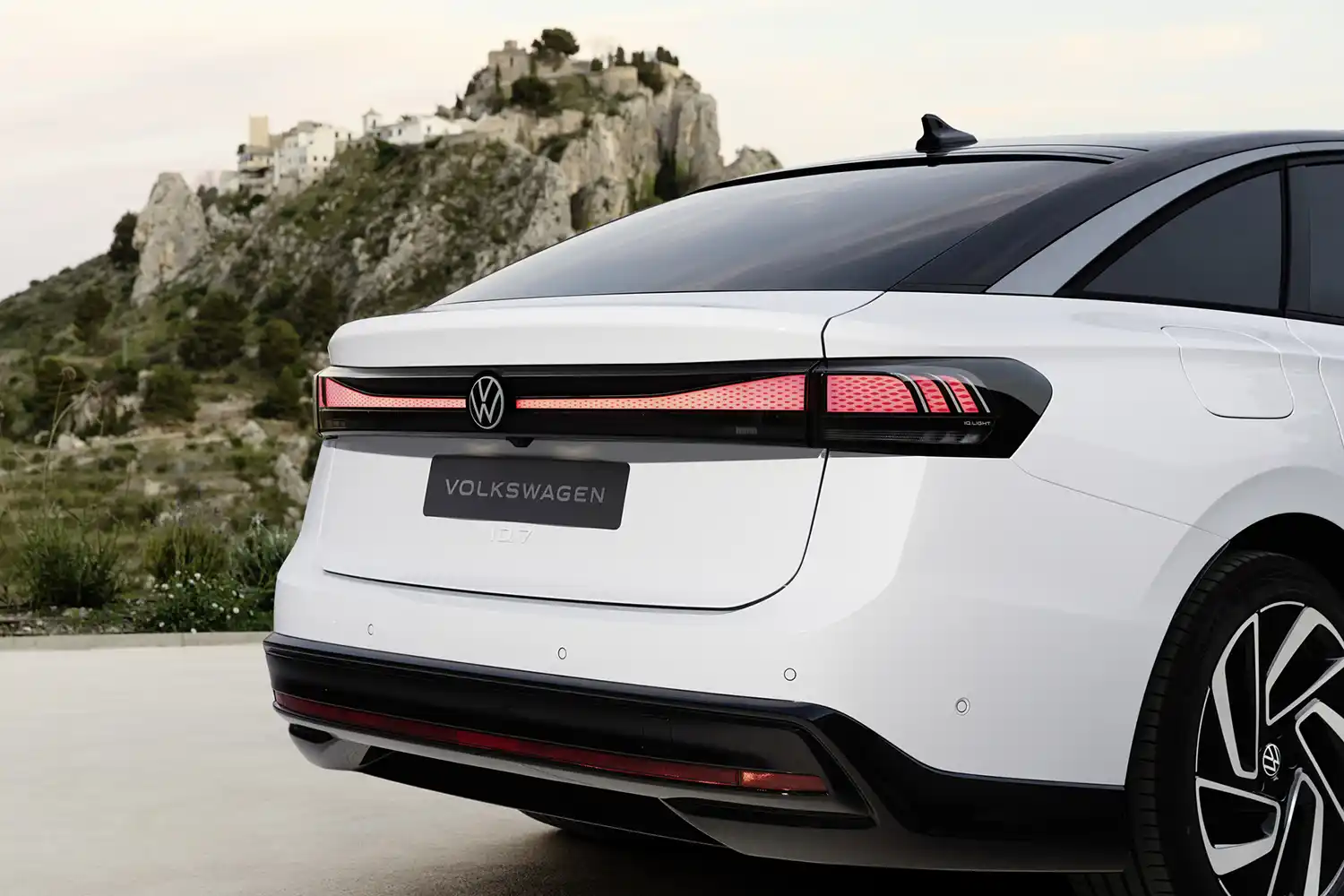 The ID.7 is almost five metres long and was designed based on aerodynamic principles. Its roof slopes elegantly to the rear in coupé style and contributes to achieving an excellent drag coefficient of about 0.23 depending on the vehicle equipment. The long wheelbase and short overhangs create plenty of space in the vehicle interior for all occupants.
