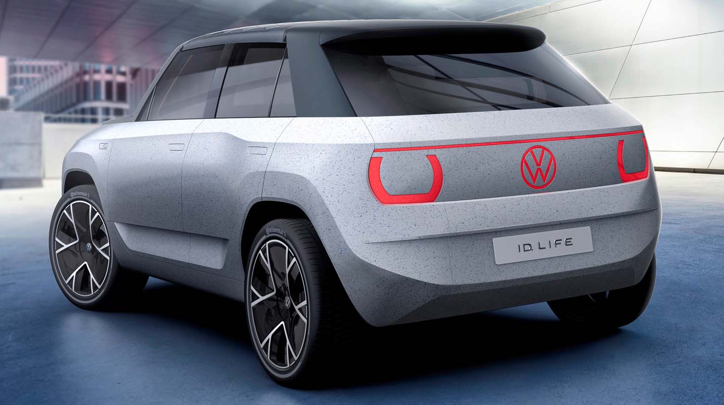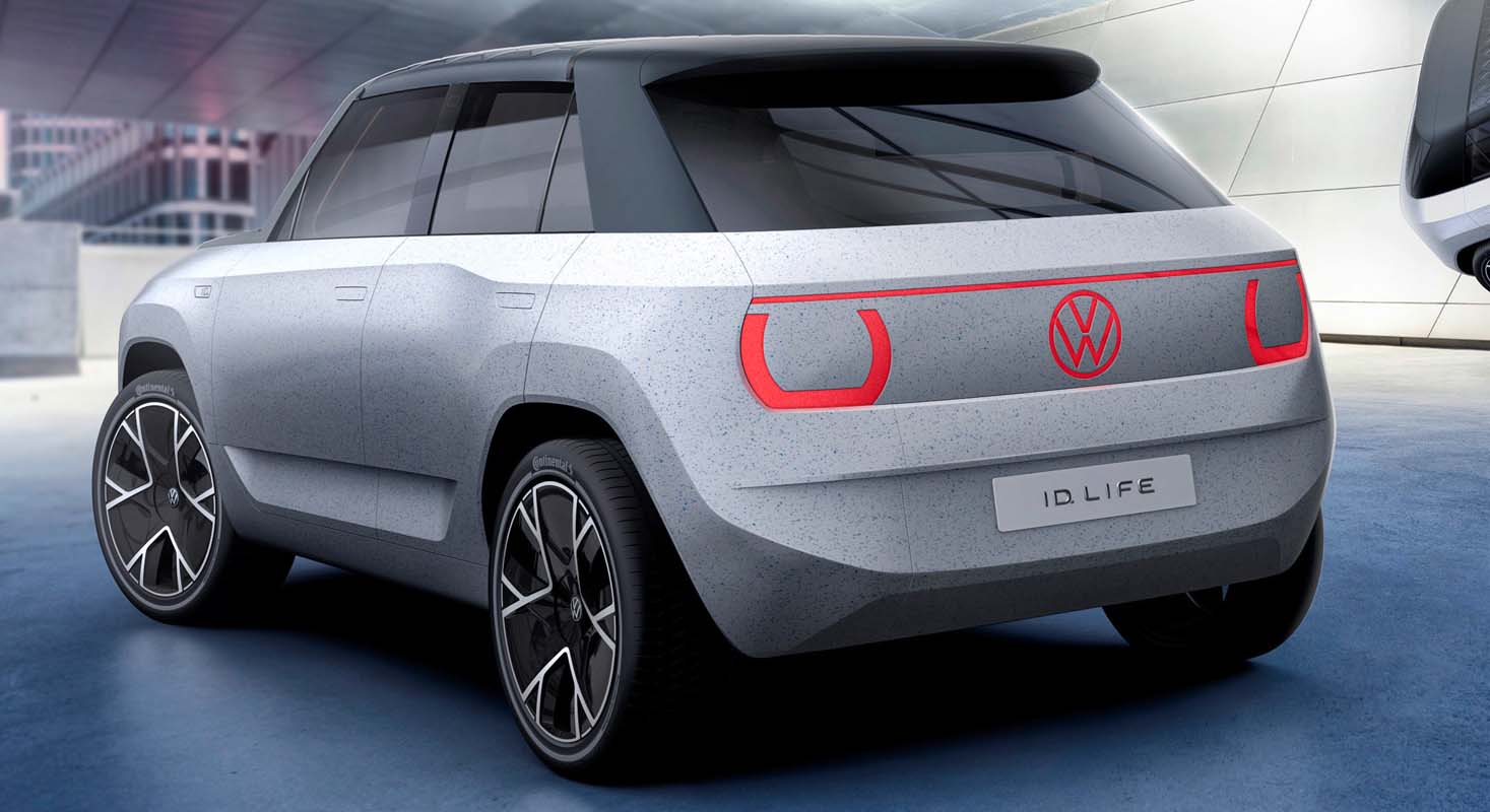 Pared-down design. The design of the ID. LIFE is strikingly clear, pared-down and high-quality. Decorative elements and add-on parts are dispensed with, as is any complex mix of materials. The horizontal division between the body, glass surfaces and roof also contributes to the car’s purist appearance. An individualised and removable roof made of air chamber textile lends an open-air feeling in the ID. LIFE, while also reducing the vehicle weight.