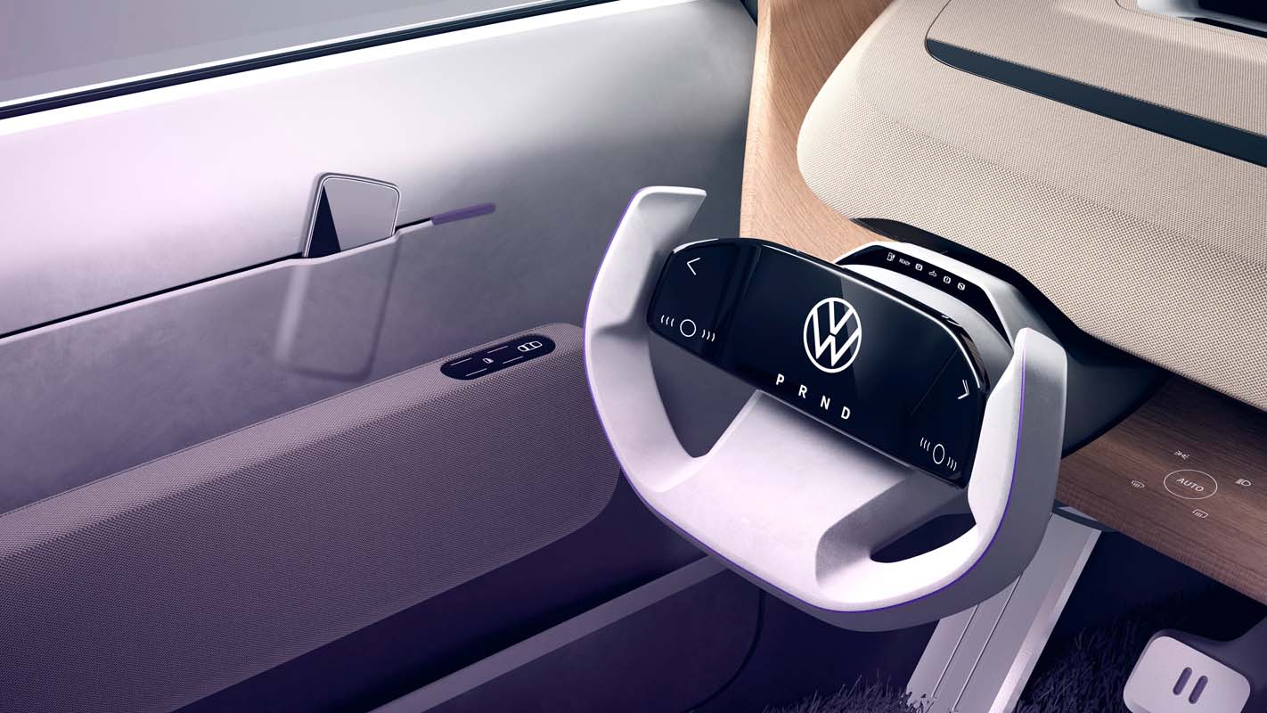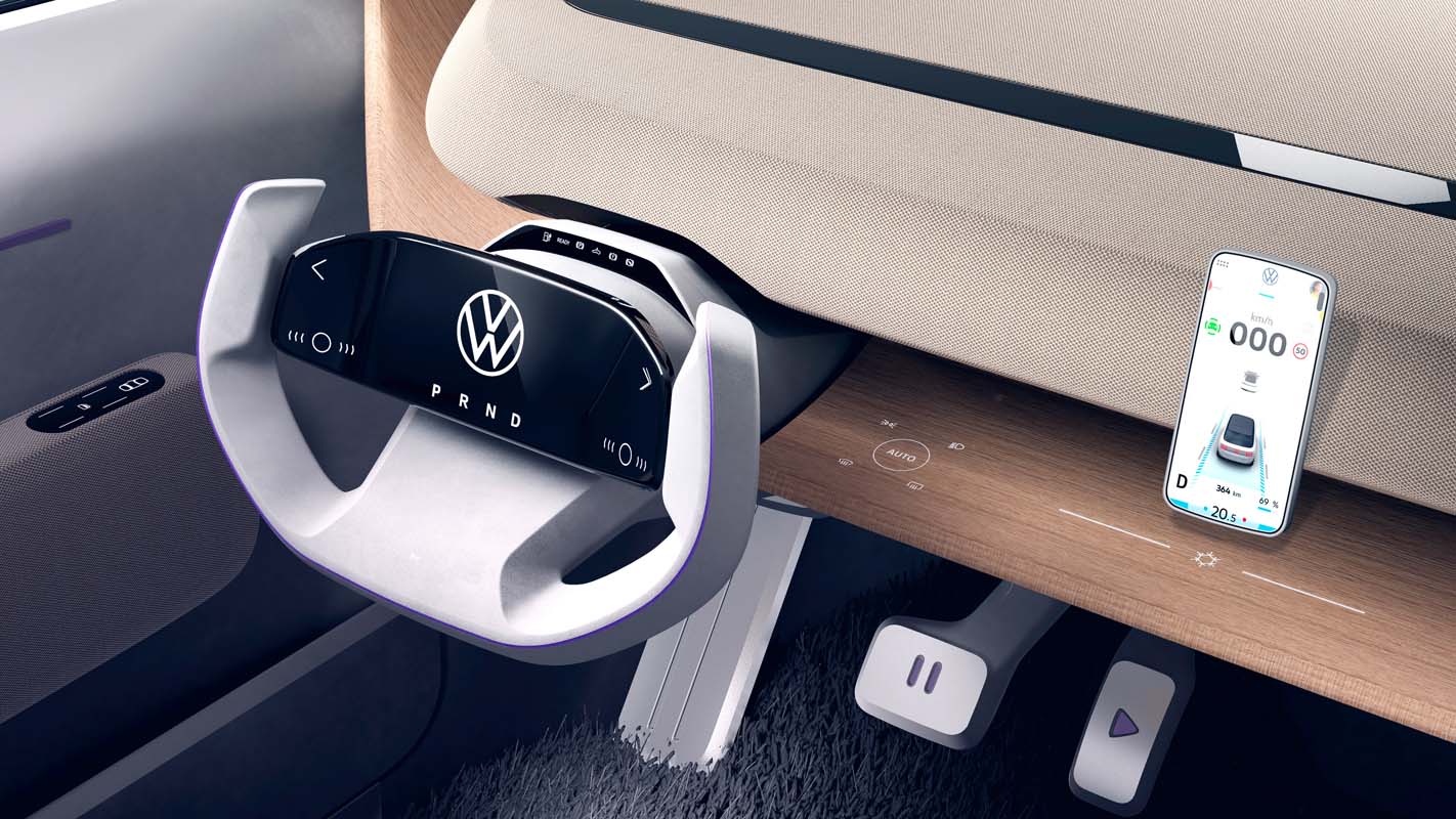 Innovative digital operating concept. Cameras and a display replace both the exterior and interior mirrors. Essential driving functions are controlled via a touch panel on the hexagonal, open-topped steering wheel, and a smartphone can be integrated in the operating system. Personal devices – whether smartphones or tablets – can be used to operate the navigation system, for instance. Music, films and games stored on the device can be used seamlessly in the ID. LIFE, with visuals displayed on the projection screen.