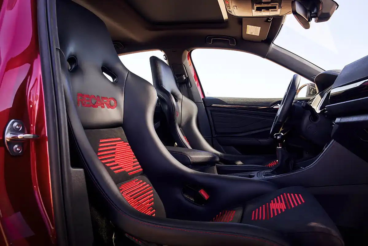 Building off Volkswagen’s EA88 Gen 3 engine, RacingLine has added its IS38 turbo-based performance package. An R600 Carbon Fiber Cold-Air Intake and Performance Intercooler deliver the necessary flow of cool air, while an oil management kit and oil cooler aid with thermal management of the motor’s oil. Power is delivered to the front wheels via the factory six-speed transmission mated to an upgraded performance clutch package.