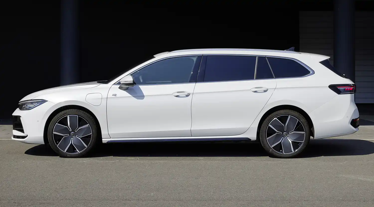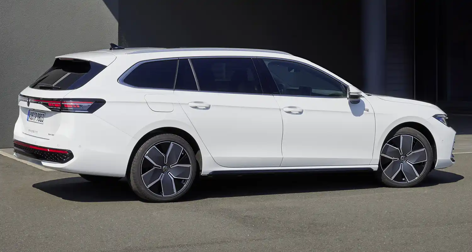 With its powerful side body surfaces, a sharp undercut as a character line (at the of the door handles), the significantly larger wheelbase and the long side window areas, the Volkswagen Passat Variant exhibits dynamism and elegance all of its own. At the front and back, the undercut and surface design over the wheel housings form powerful shoulder sections in a slim silhouette. The striking D-pillars match this sporty image with their pronounced forward angle and dynamic look. Under the slightly flared wheel housings, the Passat Variant sports up to 19-inch wheels.