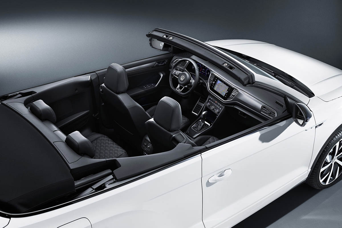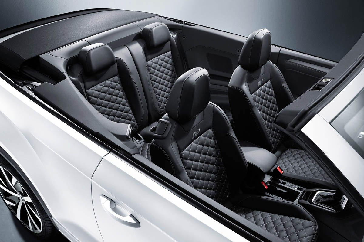 The long wheelbase provides the basis for a generous interior package. The height above the road in relation to the H-point is 599 mm for the driver and front passenger and even 616 mm for rear passengers. The luggage compartment has a capacity of 280 litres – regardless of whether the soft top is open or closed. The versatility of the T-Roc Cabriolet is highlighted by the folding rear seat backrests, released by means of levers in the luggage compartment, and the optional tow bar.