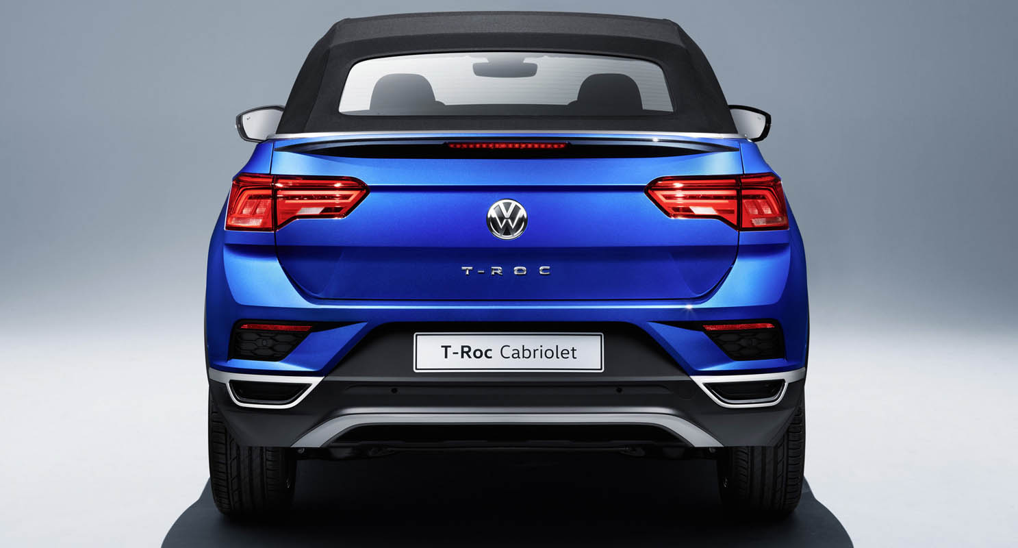 Horizontal lines dominate the rear of the T-Roc Cabriolet, giving the open-top cross-over a flat, wide and sporty appearance. The third brake light is integrated in the spoiler. A contour runs between the sculpturally shaped tail light clusters, continuing the character line over the boot lid. The Volkswagen logo and the lettering “T-Roc” have been positioned below. The exhaust trim covers and the diffuser insert are trapezoid in shape.