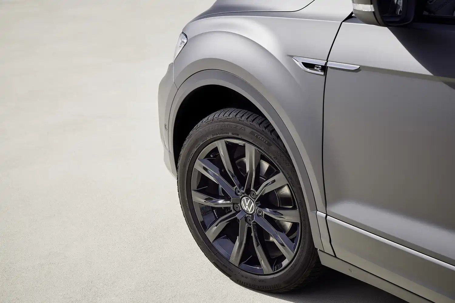 Black accents for a special appearance. The sporty R-Line specification (including sports running gear and progressive steering) provides the basis for the new special edition model. The standard equipment also includes the Black Style design package with black trim strips and mirror covers and a black rear spoiler. The door handles and T-Roc lettering on the rear are also in Deep Black. Black-painted 18-inch wheels in Grange Hill design round off the overall appearance.