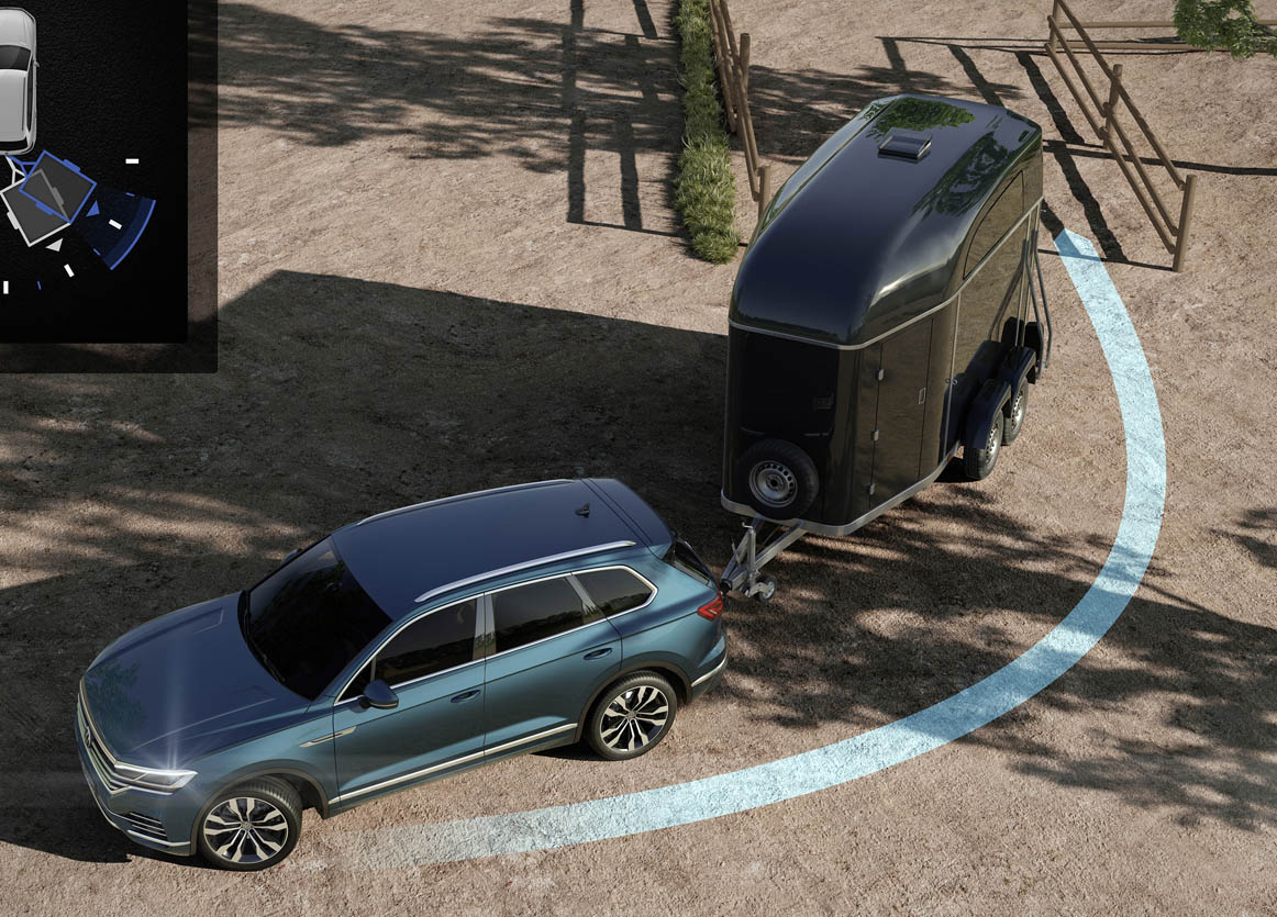 ‘Trailer Assist’ relieves drivers of the complicated re-thinking otherwise required while reversing with a trailer, namely having to turn the steering wheel to the left to get the trailer to turn to the right – and vice versa. Another overall goal was to make reversing straight back over longer distances easier and more precise. Trailer Assist is now able to do this almost automatically by itself. To reverse a Touareg with a trailer into a driveway or parking bay from the street, all the driver needs to do is stop at a suitable spot and engage reverse gear. The system is activated by pushing a button. Then the current driving angle and possible angles are visualised in the instrument cluster. These are computed by image processing algorithms based on data from the rear-view camera system, which monitors and analyses the articulation angle between the car and the trailer. By using the mirror adjustment switch, which serves as a sort of joystick, the driver can adjust the desired driving direction of the car-trailer combination. The Volkswagen Touareg executes the steering commands entered by the driver, who only needs to operate the accelerator pedal and the brake. The driving direction of the car-trailer combination is set by automatic control of the electromechanical power steering.