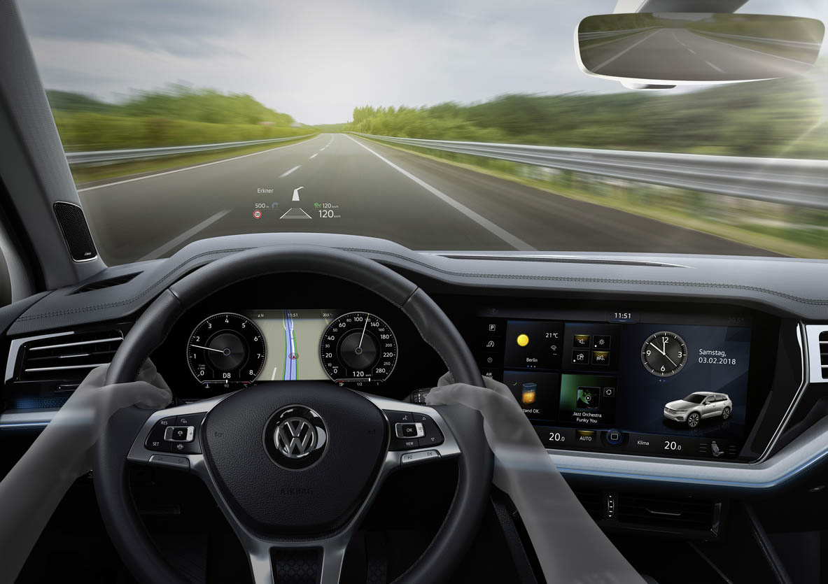 The VW Touareg is launching with the largest range of assistance, handling and comfort systems ever to be integrated into a Volkswagen. They include technologies such as the ‘Night Vision’ assistance system (detects people and animals in darkness via a thermal imaging camera), Roadwork Lane Assist (semi-automated steering and lane keeping, accelerating and braking up to 60 km/h), Front Cross Traffic Assist (reacts to cross traffic in front of the Touareg), active all-wheel steering (makes the Touareg handle like a compact car), new roll stabilisation with electro-mechanically controlled anti-roll bars and ‘IQ.Light – LED matrix headlights’ (interactive, camera-based dipped and main beam headlight control) and a ‘Windshield Head-up Display’ projected directly into the windscreen. The driver experiences these systems as a single unit in the new Volkswagen Touareg. They are simply there – interconnected via a new central control unit – working imperceptibly in the background and making travel safer, more convenient and more intuitive than ever.