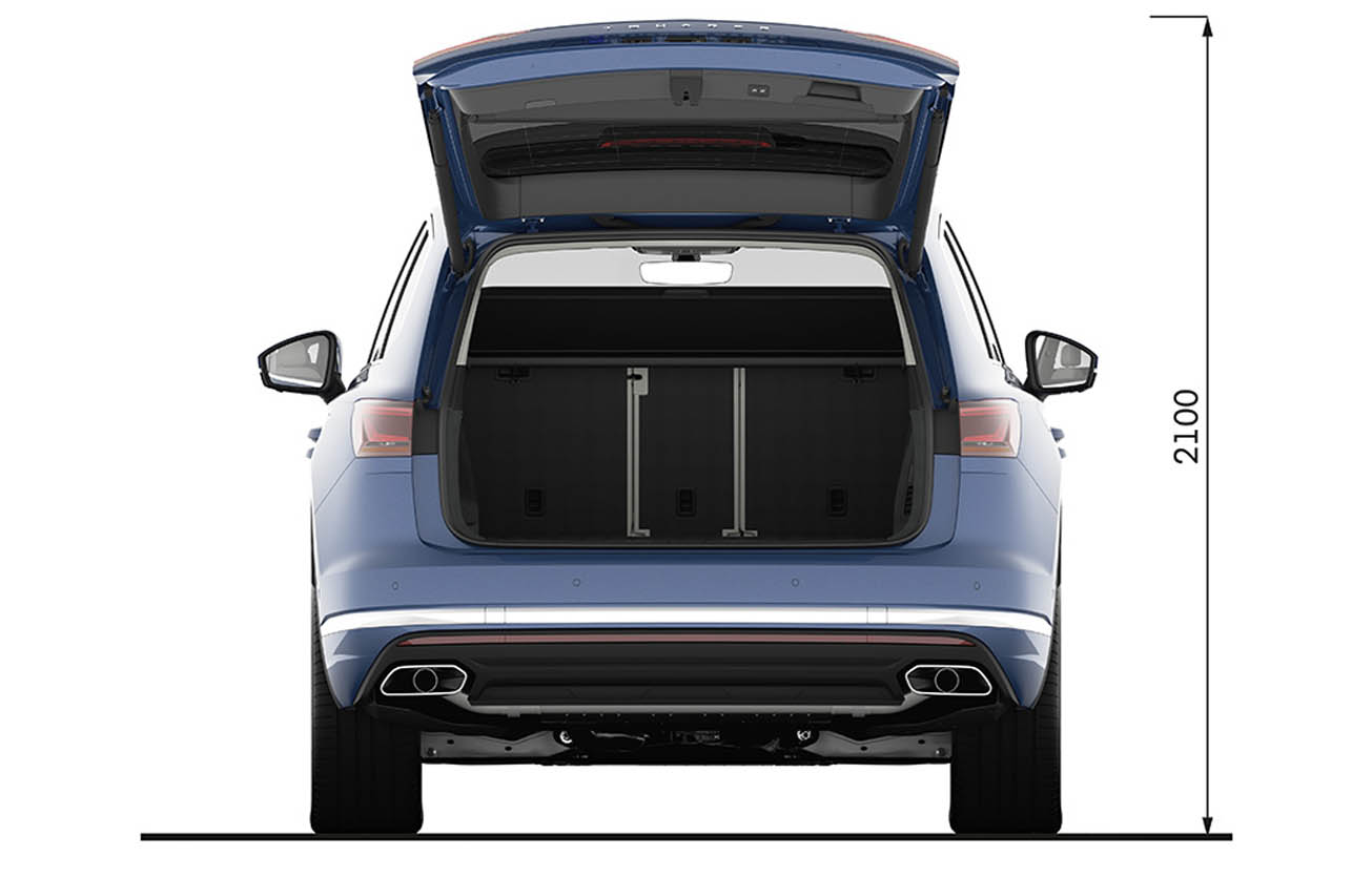 Compared to its predecessor, the third generation Touareg is moderately wider and longer. The new dimensions have positive effects on both the vehicle’s proportions and its amount of interior space. The added exterior length leads, for example, to a significantly larger luggage compartment: its capacity has increased from 697 to 810 litres (with rear bench seat up). Cargo there is hidden from onlookers by an optional electrically extending and retracting luggage compartment cover. Despite its increased length and width, the car body is 106 kg lighter because of its mixed material construction of aluminium (48 per cent) and high-tech steels (52 per cent).